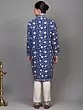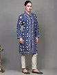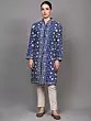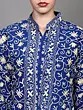 The heart of this jacket lies in its exceptional embroidery. Skilled artisans have painstakingly applied the Aari technique, a traditional Indian needlework known for its speed and ability to create flowing, continuous patterns. The delicate motifs of intertwined leaves and blossoms form an organic, captivating jaal that cascades across the vibrant blue wool. Each stitch is a testament to the dedication and expertise of the craftspeople, resulting in a garment that is not merely clothing, but a wearable piece of art. The contrasting thread color ensures that every detail of the embroidery stands out, drawing the eye and inviting admiration.