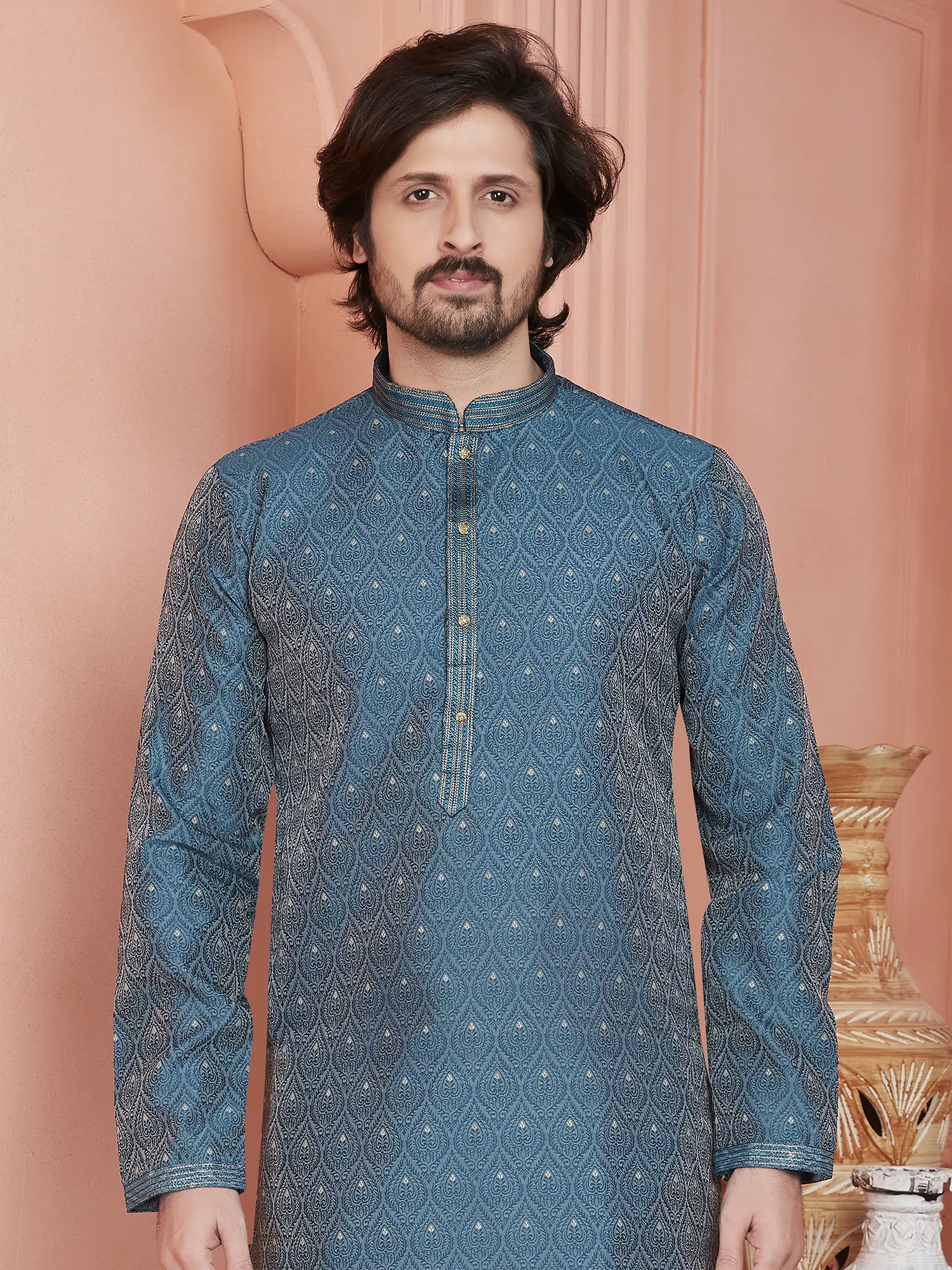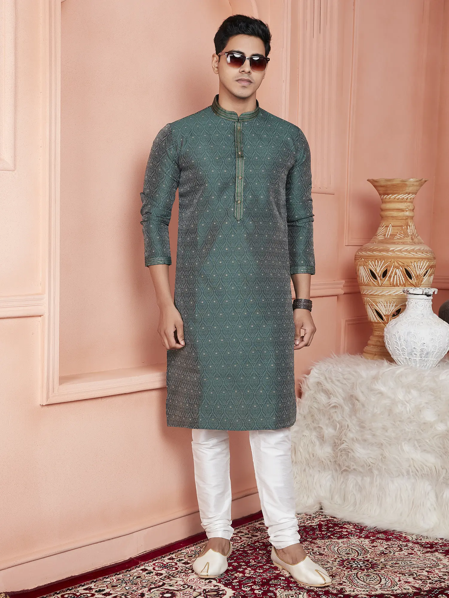 Men's Classic Mandarin Collar Attractive Jacquard Silk Brocade Kurta With Pajama