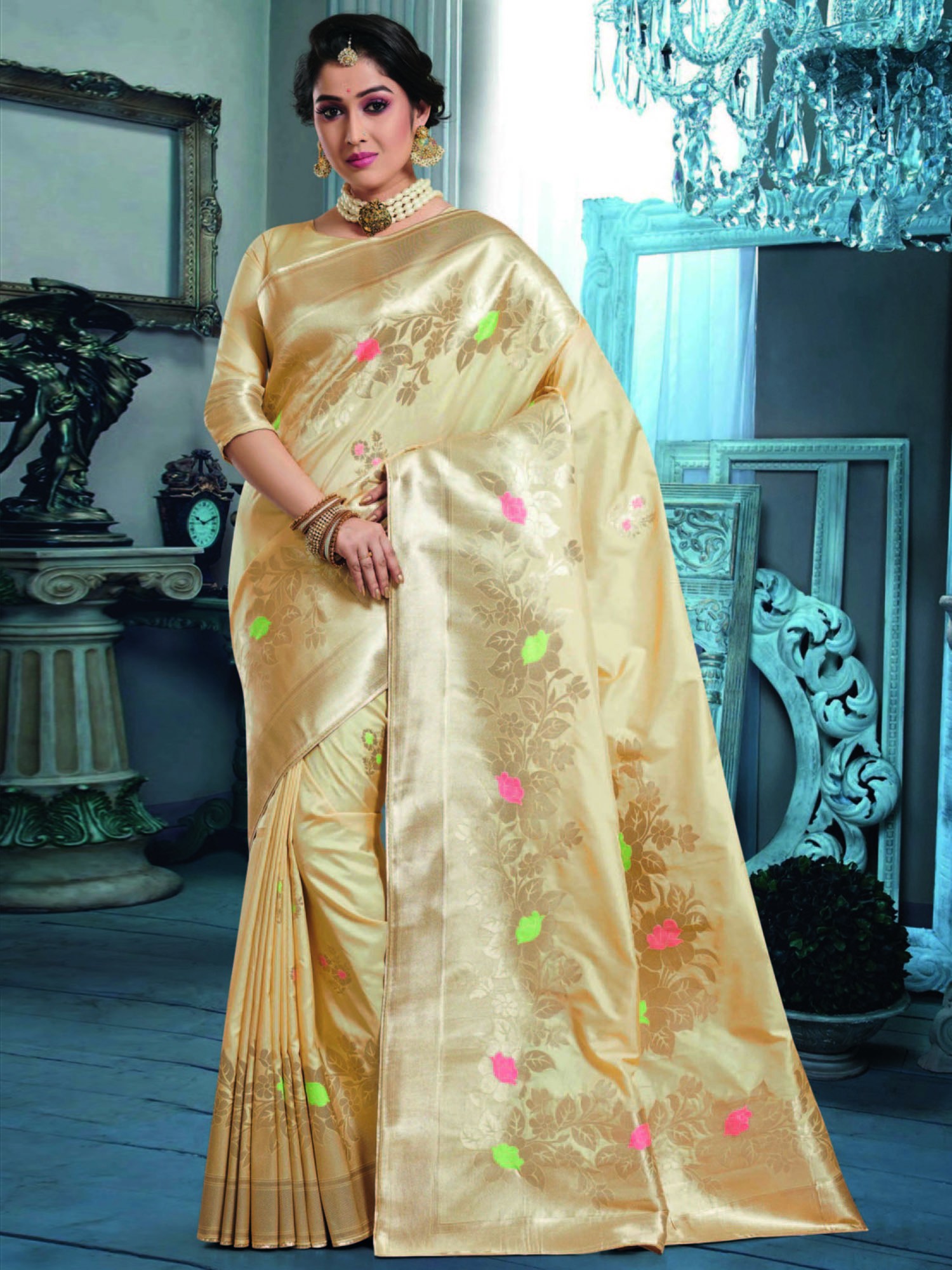 The queenly hue of cream in traditional Indian wear is an understated celebration of royalty and luxuriousness. In this cloud-cream Banarasi silk saree, the floral pattern is spread beautifully all over the drape, tinted with neon pink and green that adds a hint of modern chic appeal to the classic Banarasi.