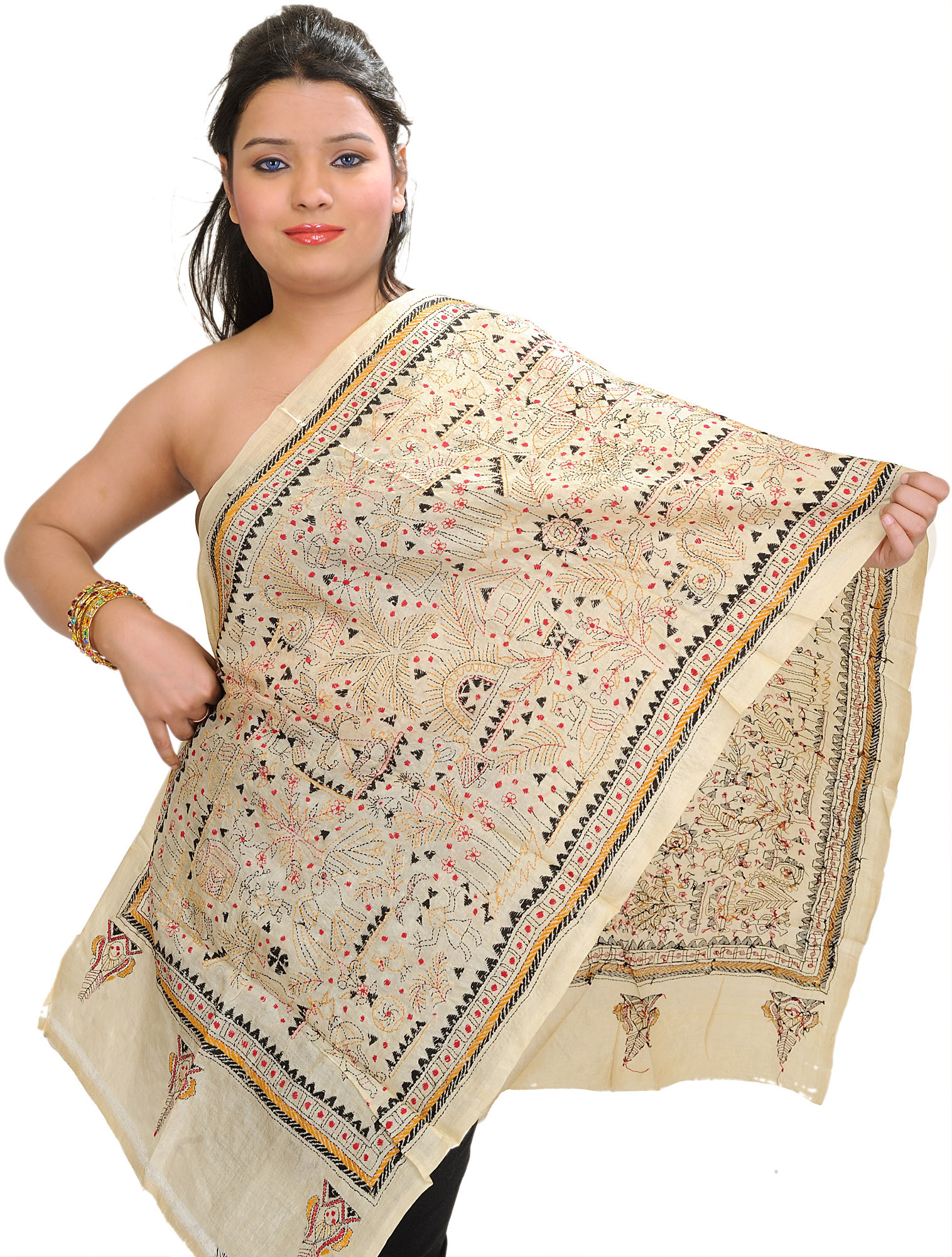 Lambs-Wool Nakshi Kantha Dupatta with Black Color Hand Embroidered Warli Inspired Motif