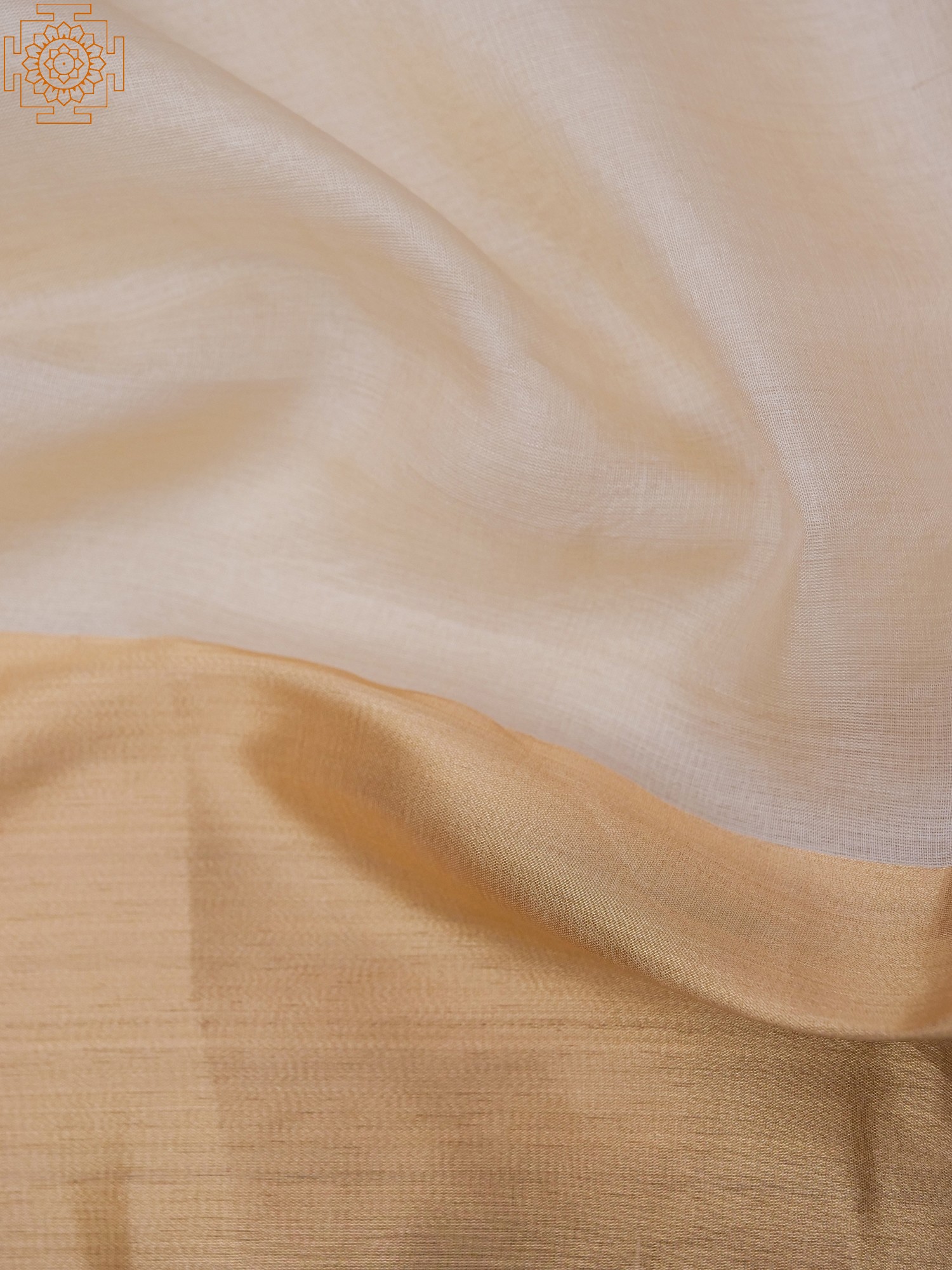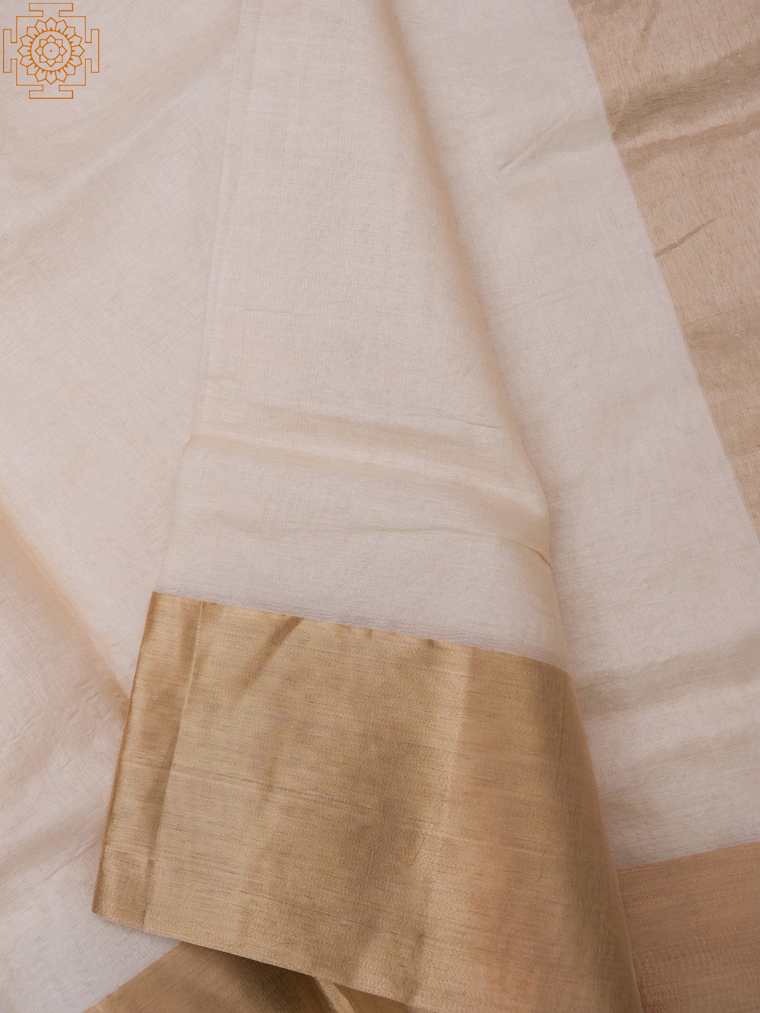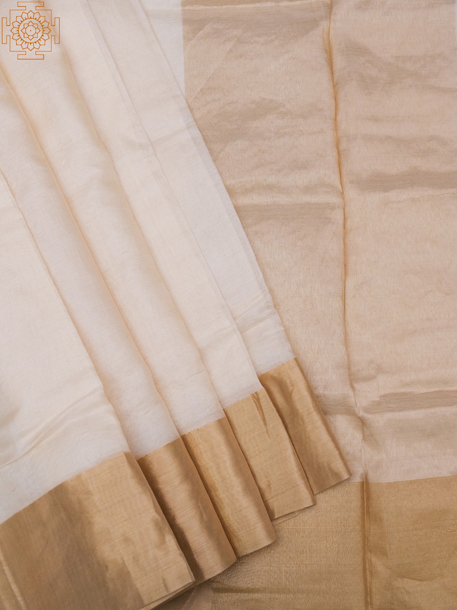 The border of the saree has an exquisite golden spread, created with Zari threads woven into the tussar fabric intricately.