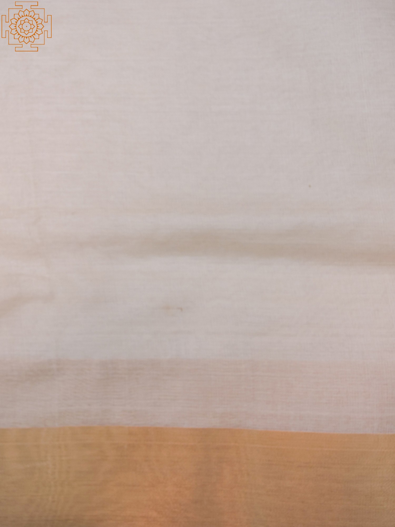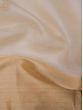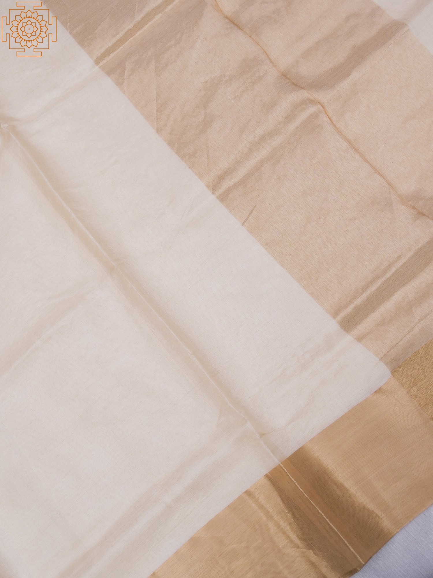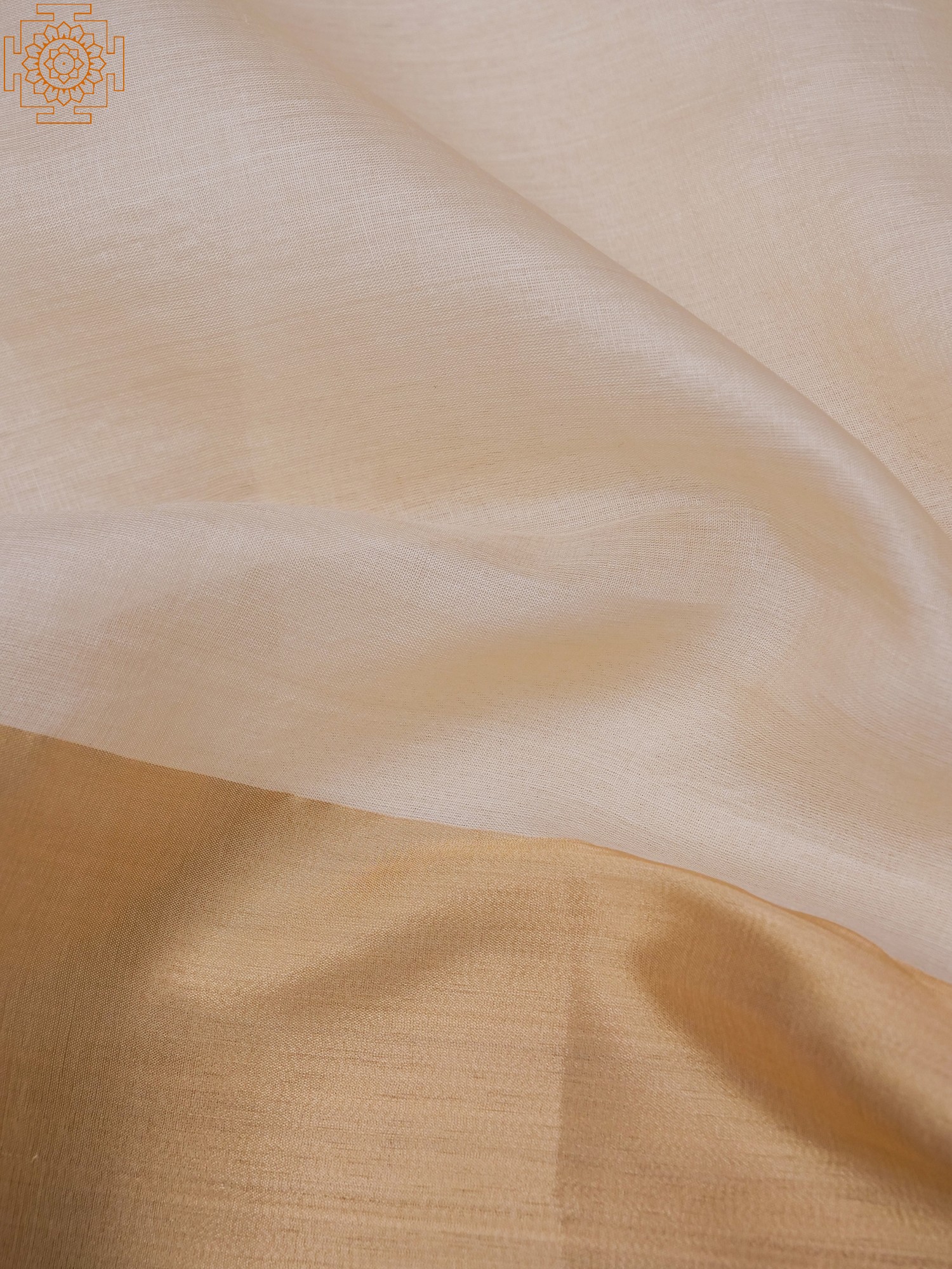 The border of the saree has an exquisite golden spread, created with Zari threads woven into the tussar fabric intricately.