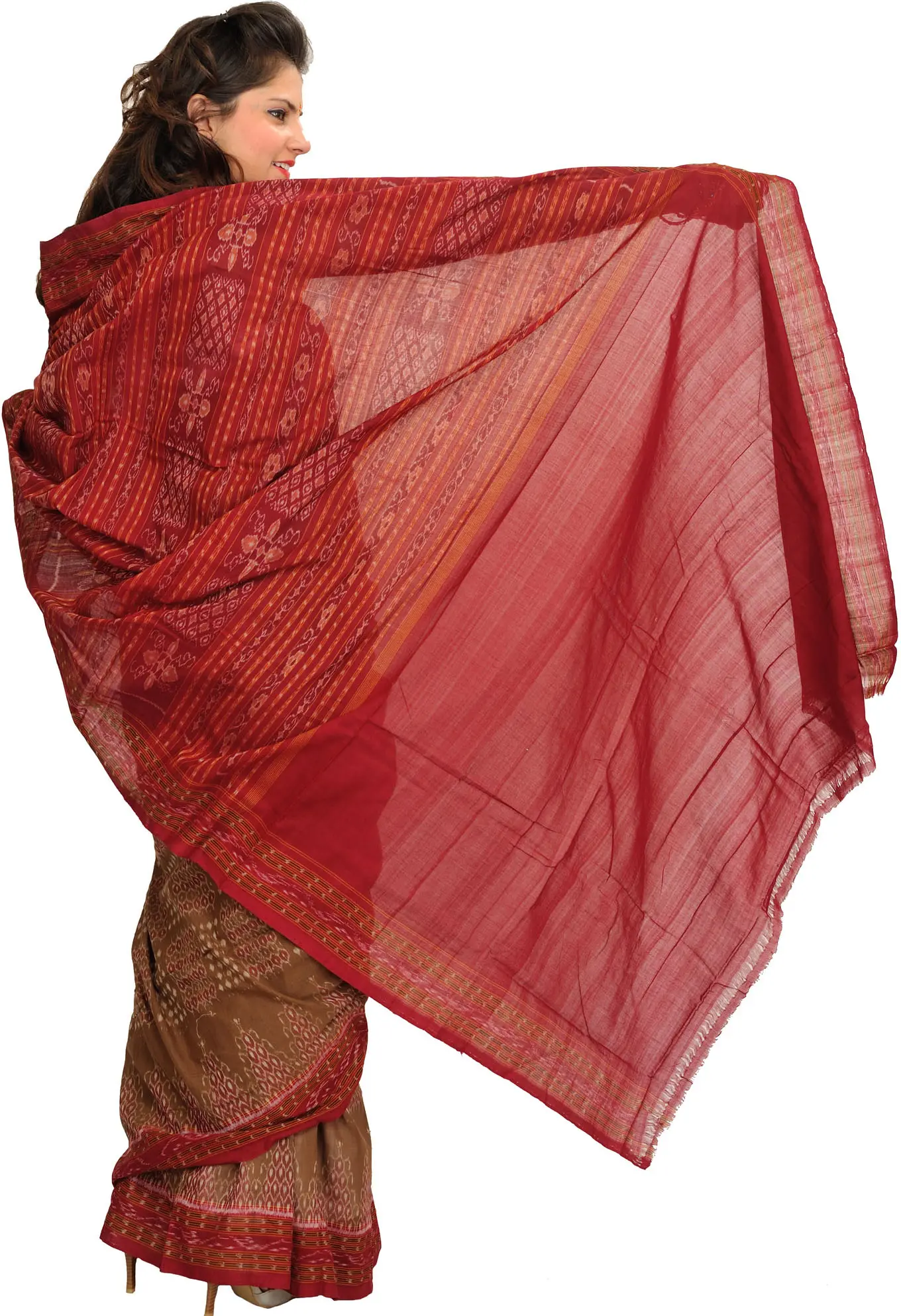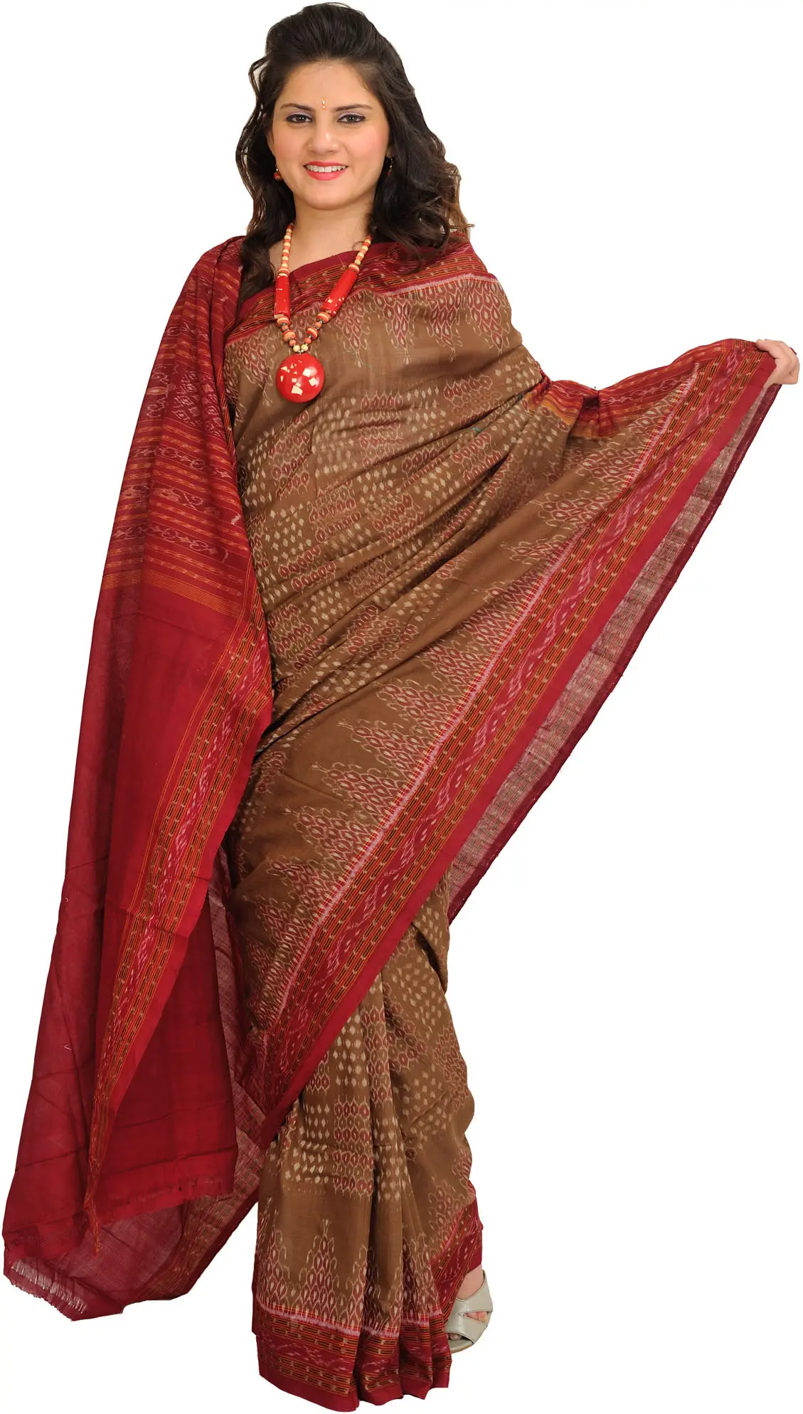 Tawny-Port Pure Cotton Ikat Handloom Saree from Sambhalpur with Woven Fish-Peacocks Wide Border