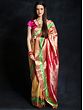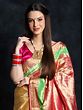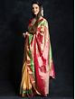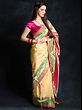 Beautiful soft hues and charming ethnic patterns combine on this color-blocked pure silk Kanchipuram saree. The delicate silk backdrop becomes enriched with lovely traditional motifs that cover the entire drape, fusing with the gorgeous tones of the silk to create an opulent appeal.