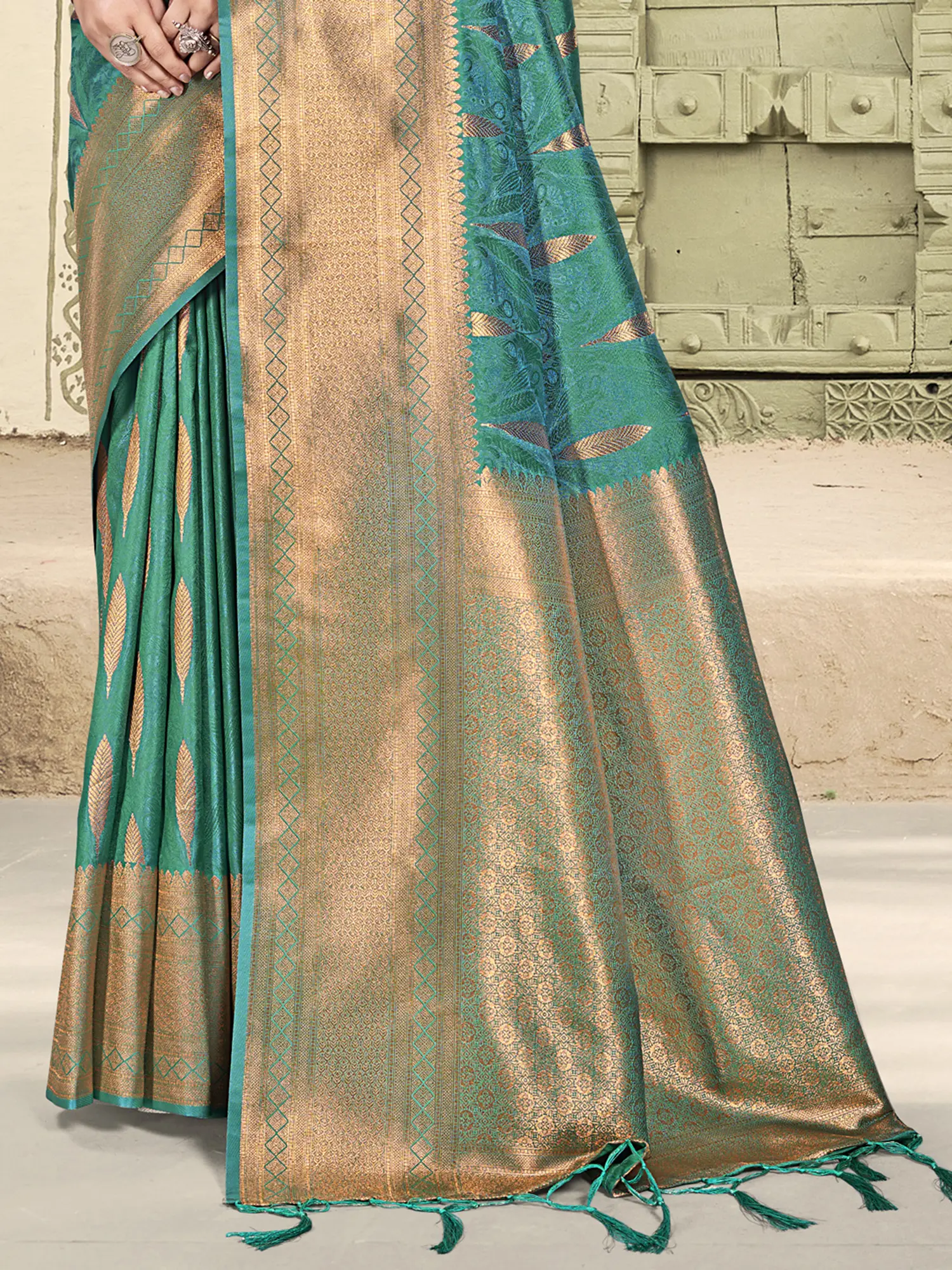 Pepper-Green Saree with Intricate Zari Thread Work Bootis and Floral Motifs Contrast Border-Pallu