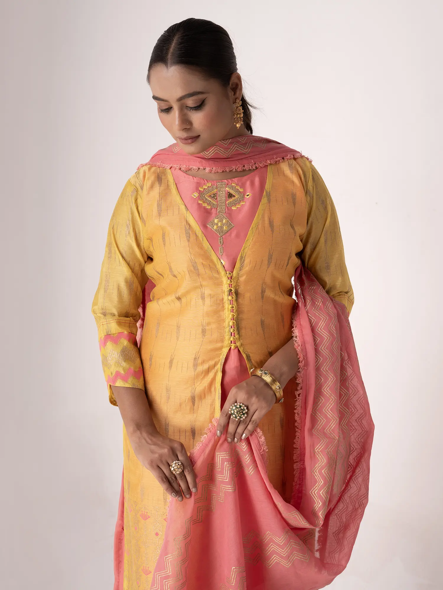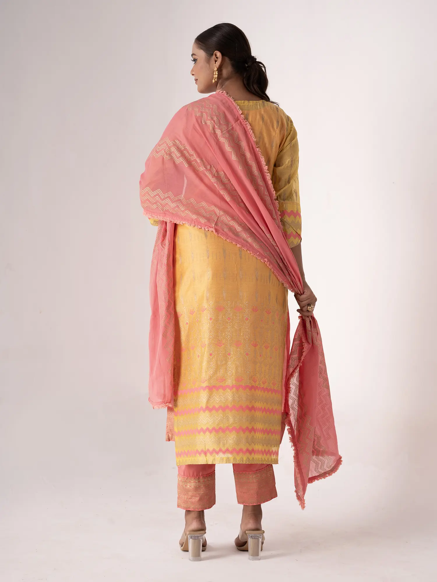 Accompanying the kameez and jacket are matching trousers, tailored for comfort and style. The trousers share the same art silk fabric and feature subtle embroidered borders at the hem, echoing the overall design theme. To complete this graceful set, a generously sized dupatta is included. The dupatta, in a matching coral-pink, is intricately patterned with gold motifs and finished with a delicate fringed border, adding a final flourish of elegance. This coordinated set ensures a polished and cohesive look, perfect for celebrations, festive gatherings, or even stylish everyday wear.