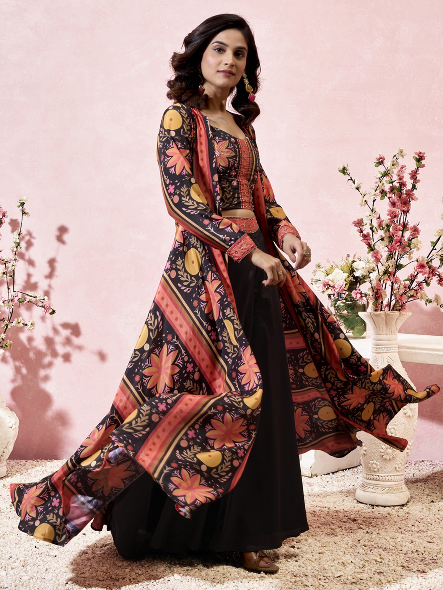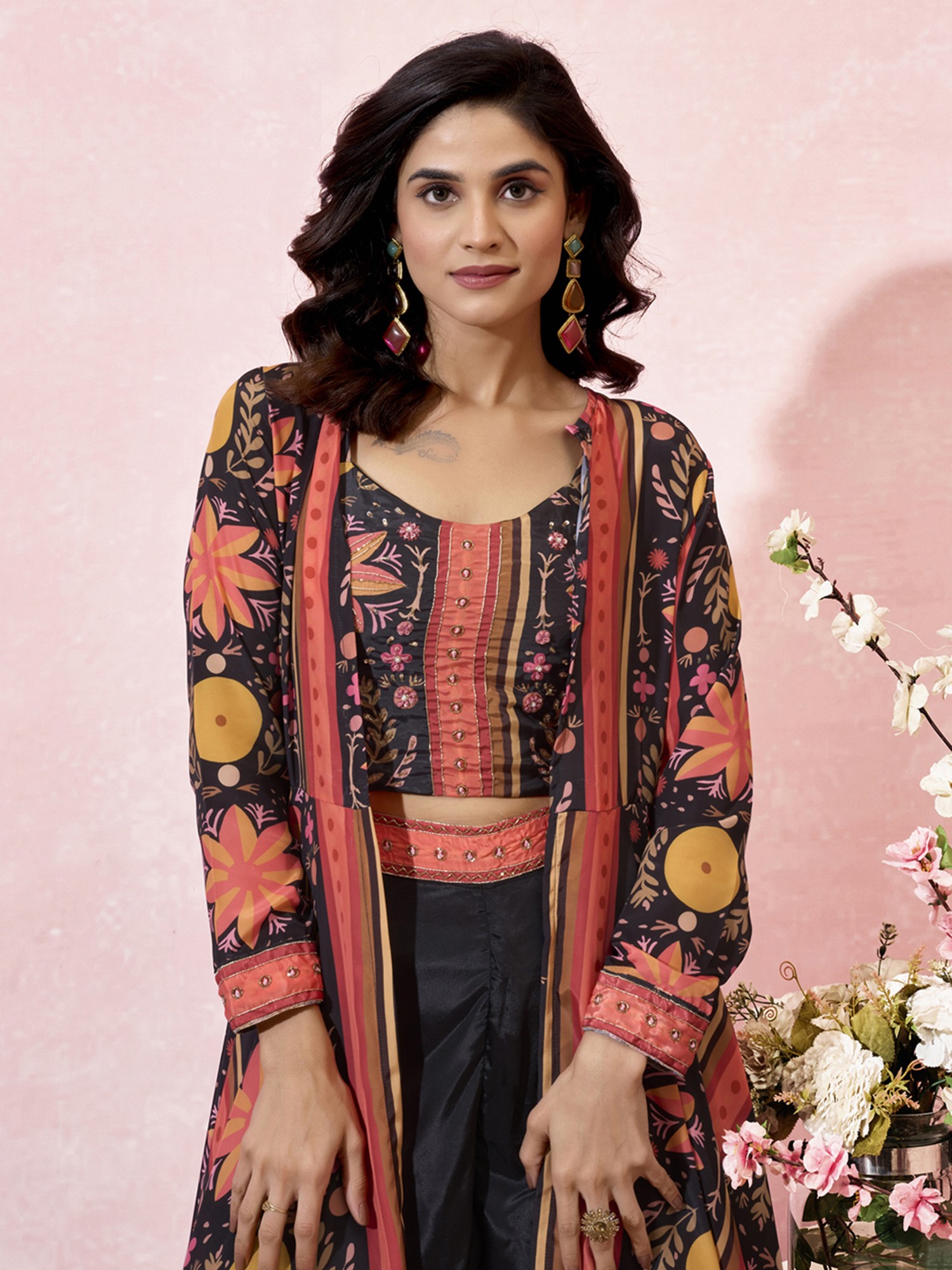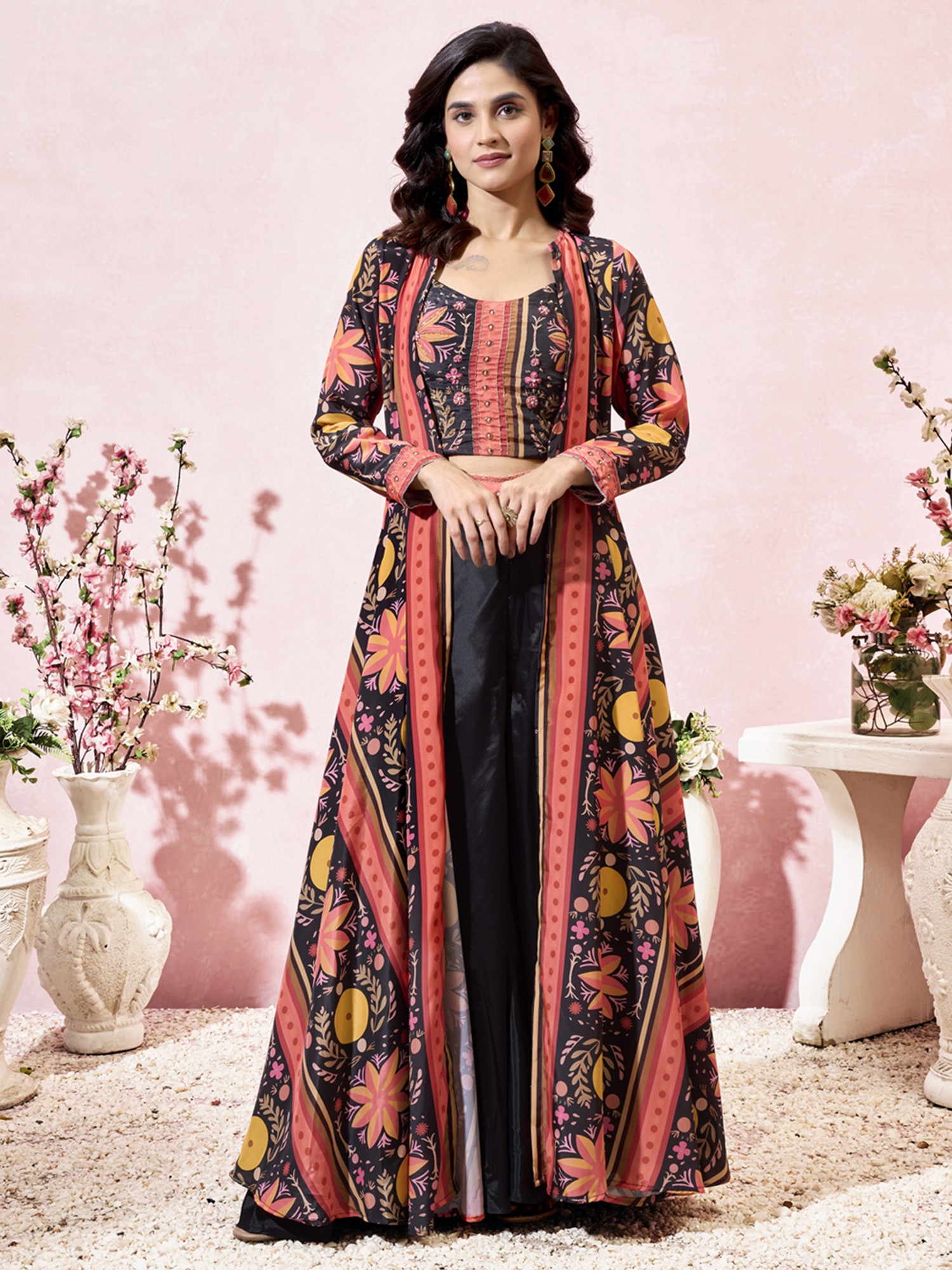 Designer Silk Floral Printed Party Wear Crop-Top Indo-Western Suit With Shrug