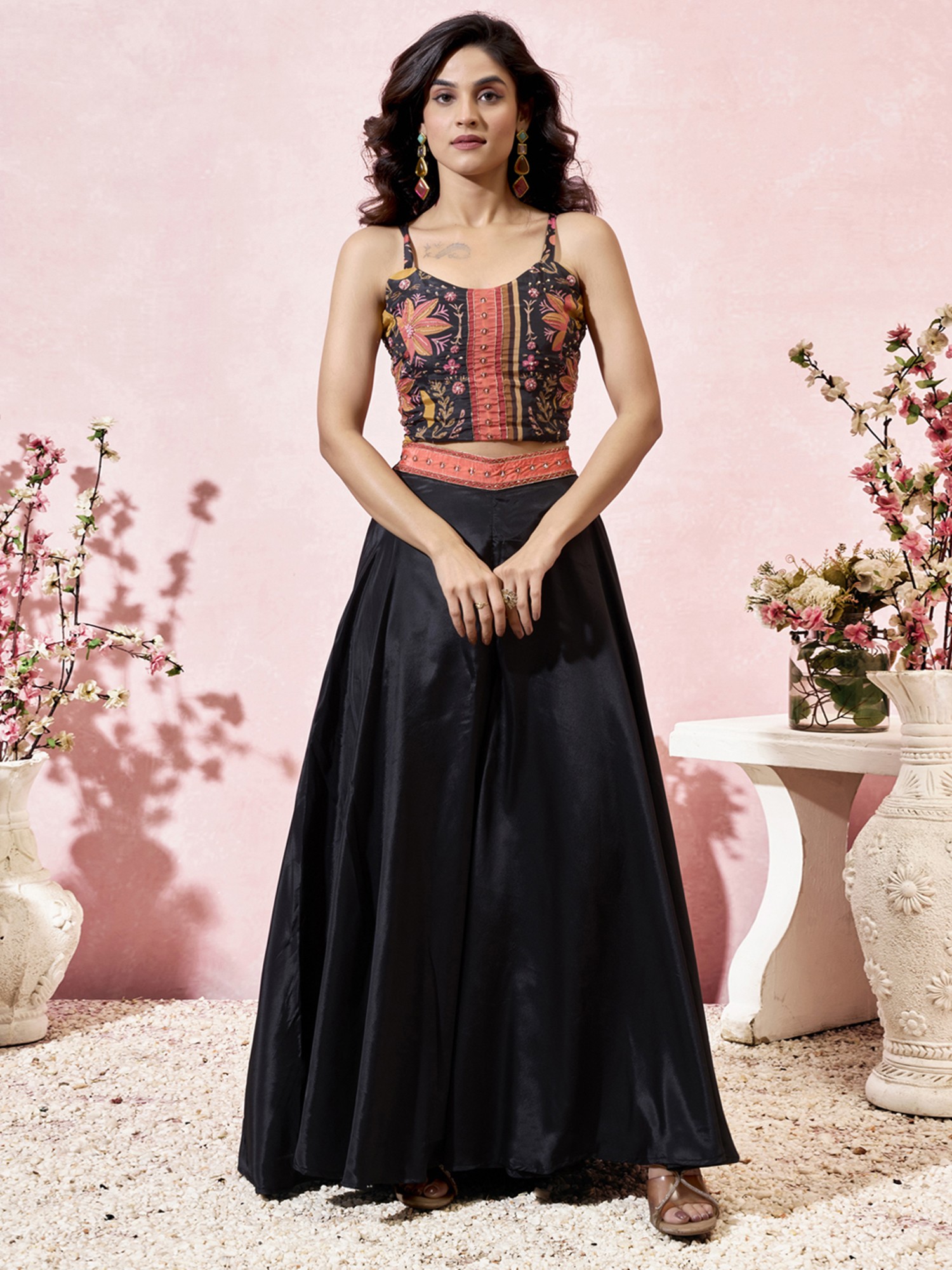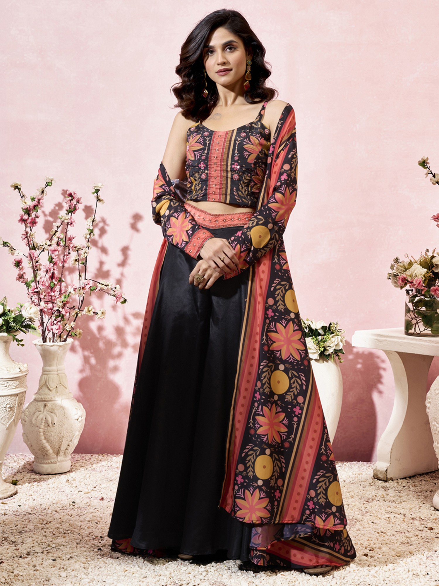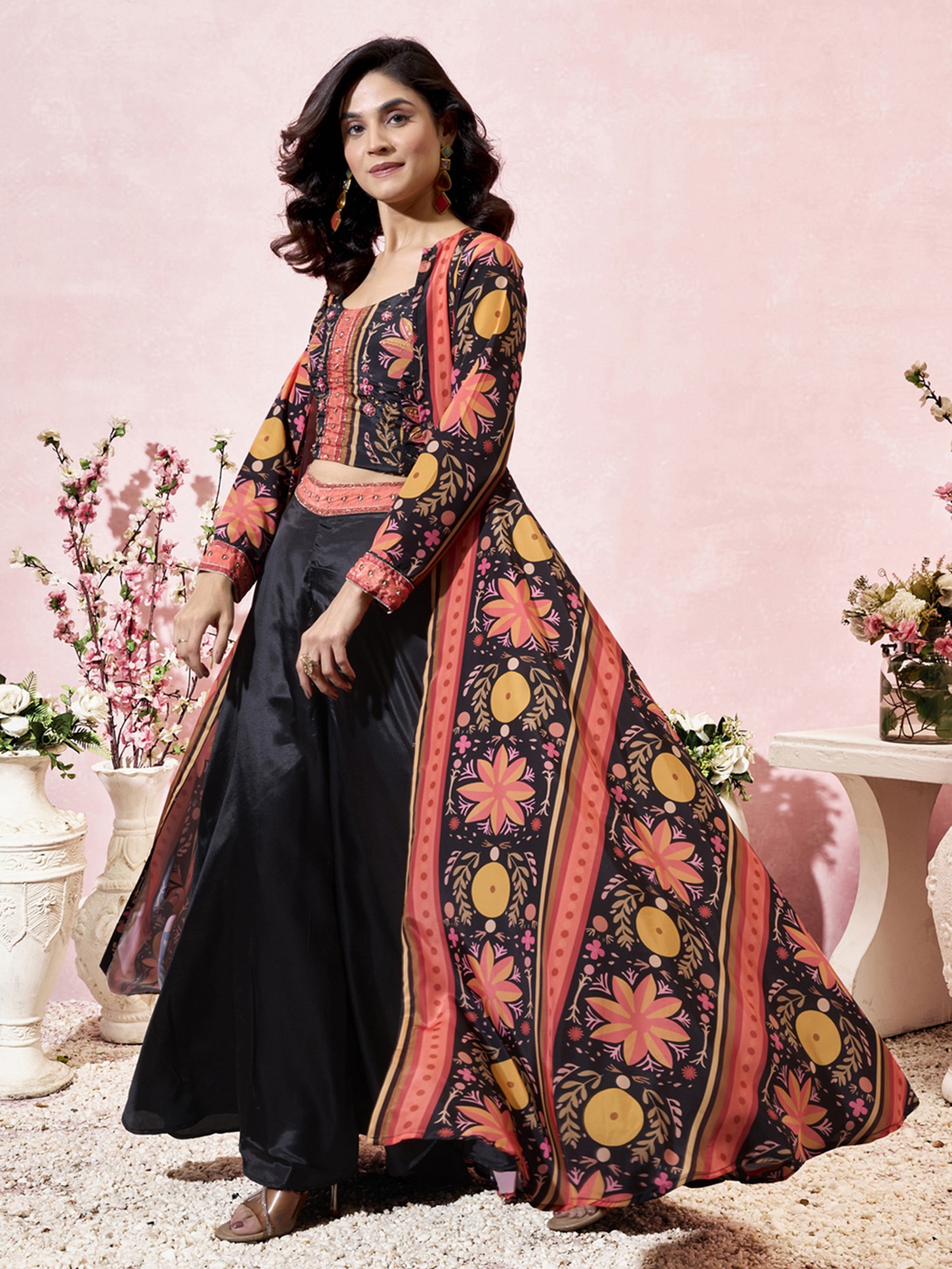 Designer Silk Floral Printed Party Wear Crop-Top Indo-Western Suit With Shrug