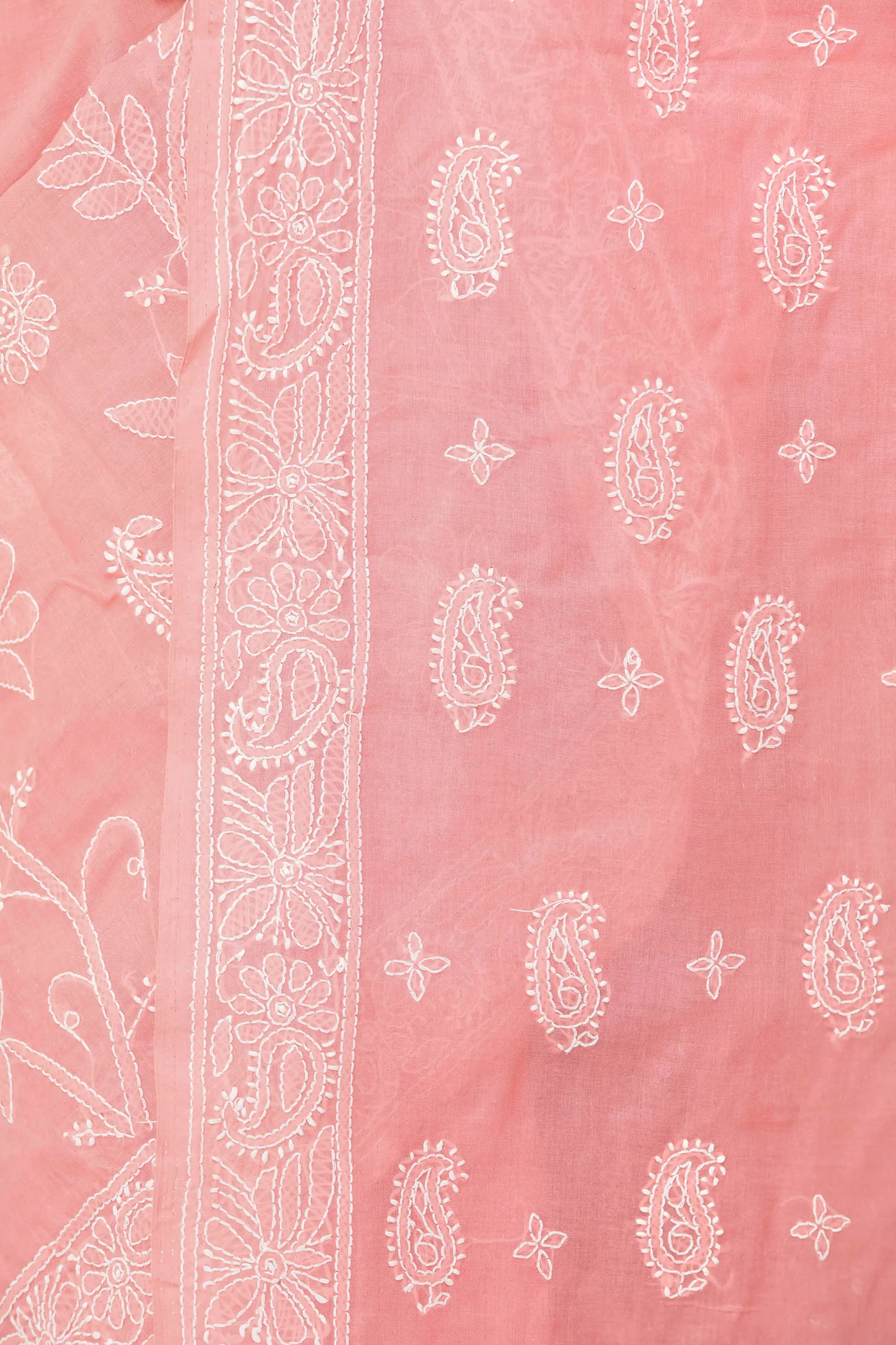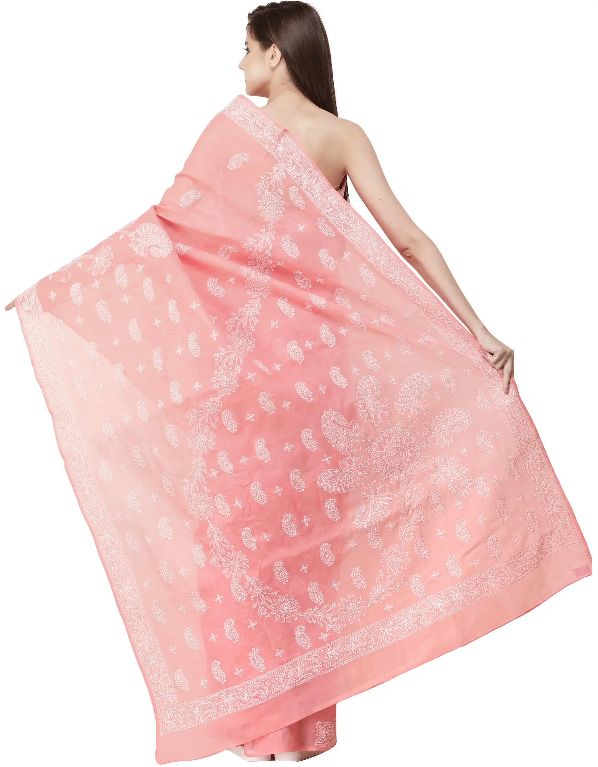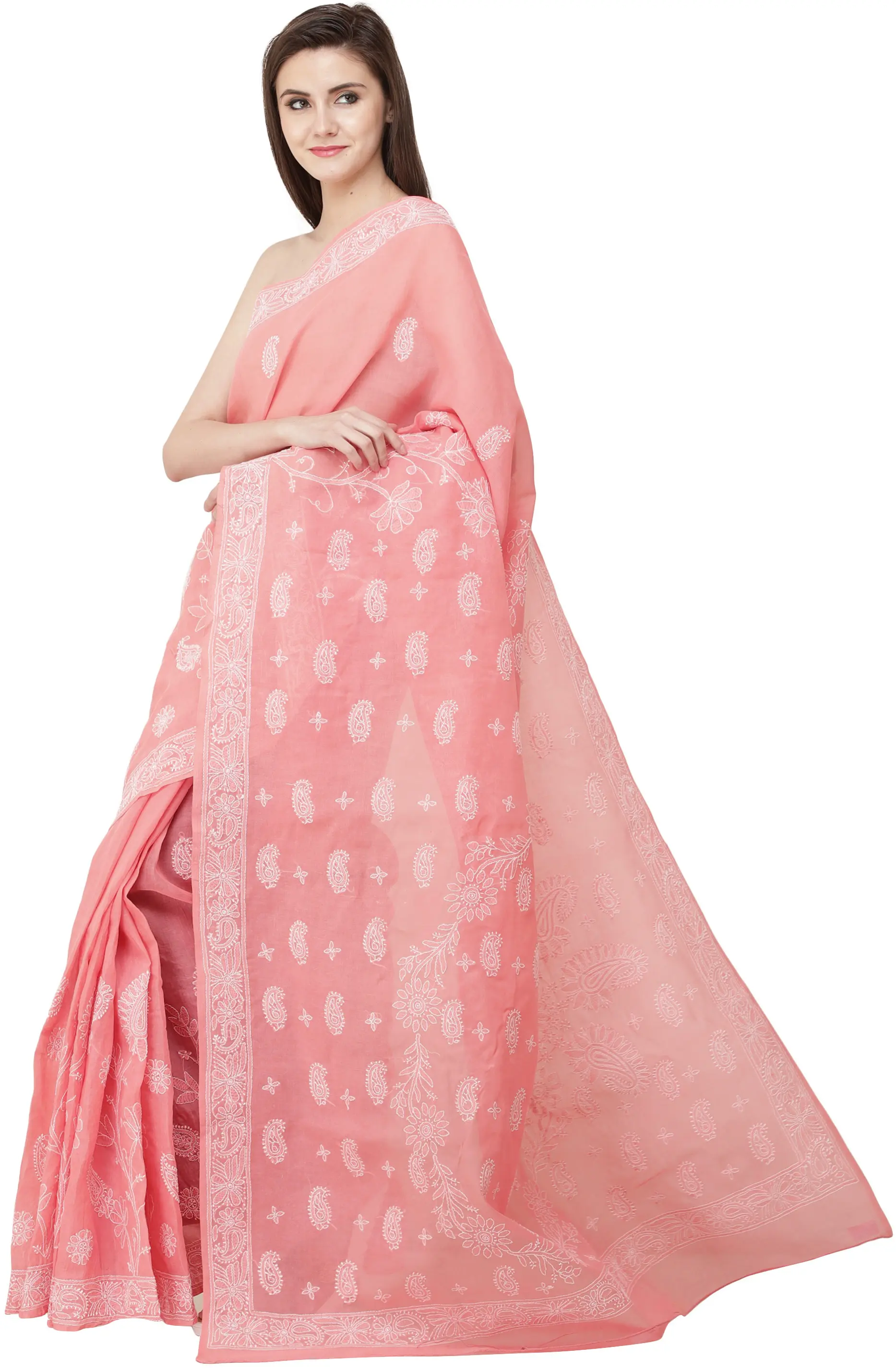 Coral-Pink Lukhnavi Chikan Sari with Hand-Embroidered Paisleys and Flowers on Pallu