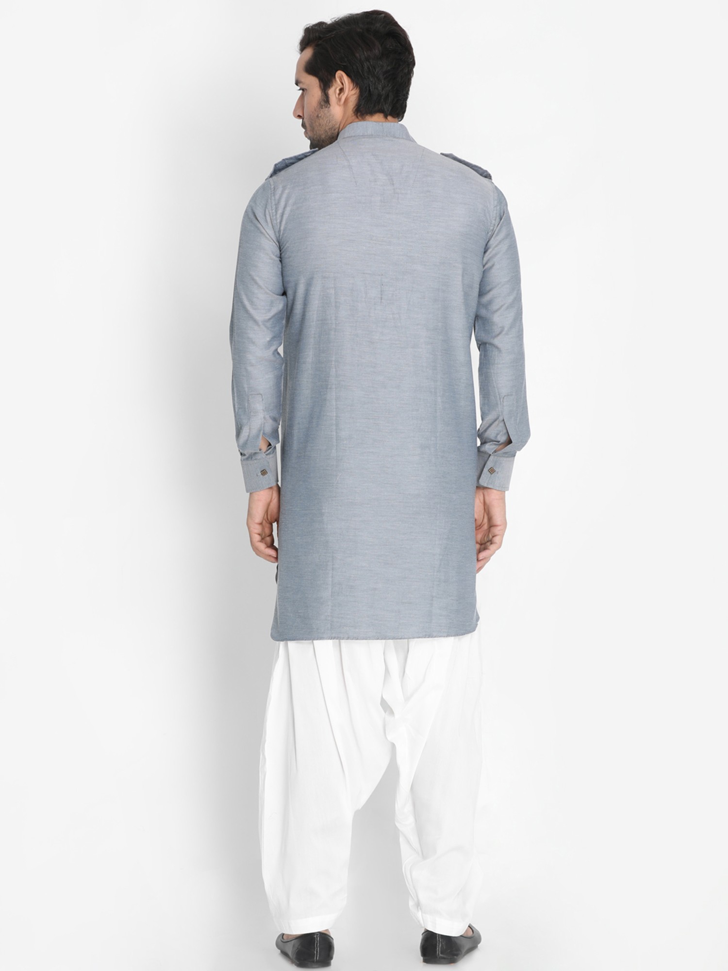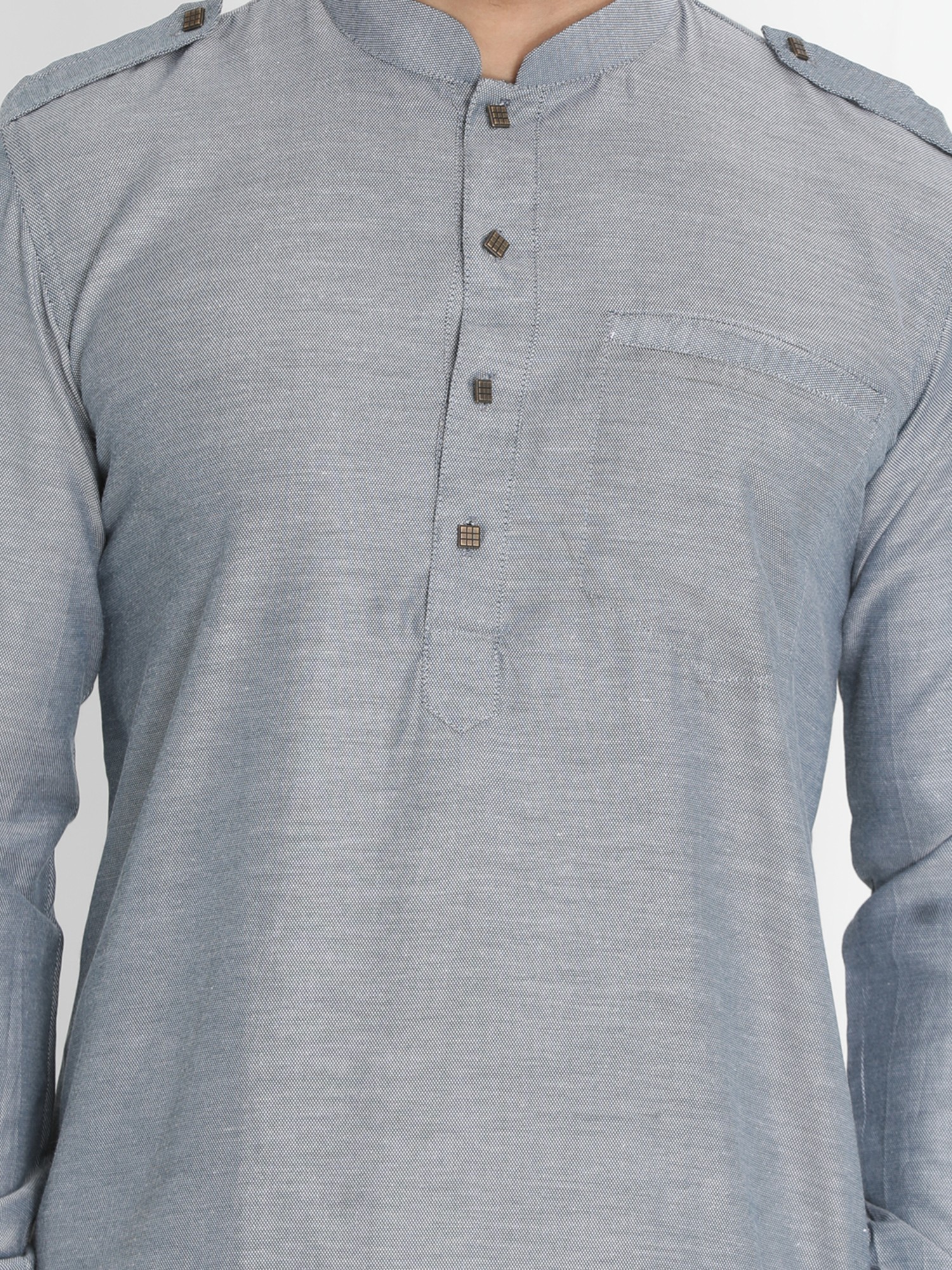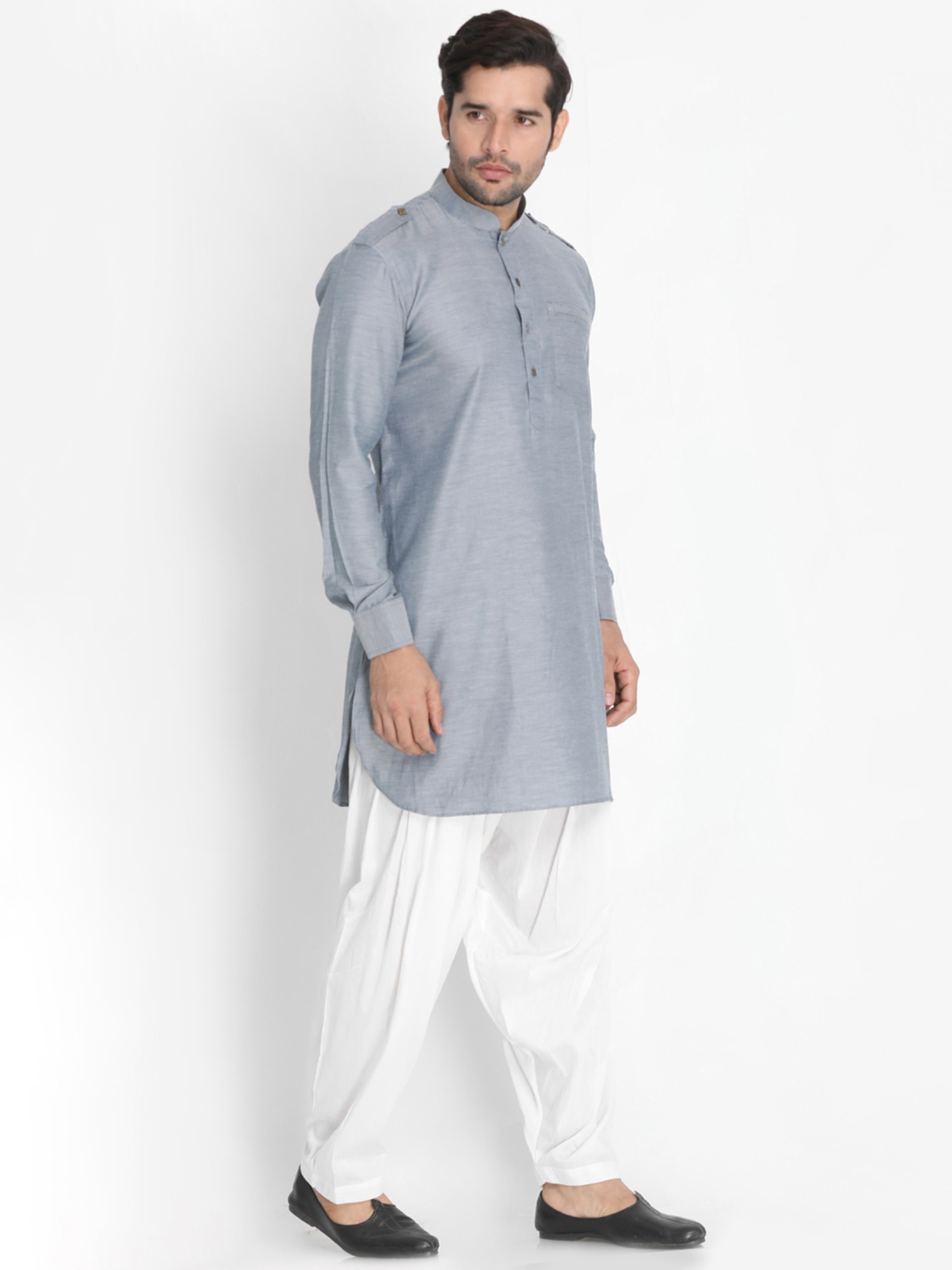 Crafted from a soft and breathable cotton blend, this ensemble ensures a comfortable fit for all-day wear. The kurta boasts a basket weave pattern, adding a touch of sophistication to its design, while the front pocket adds functionality and style. The Afghani-style Pajama, with its relaxed and roomy fit, offers both comfort and cultural flair. This attire is perfect for auspicious occasions, combining elegance with contemporary sensibilities, making it a versatile choice for those seeking comfort and style in ethnic wear.