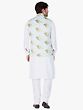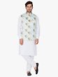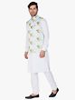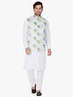 This White Kurta paired with Churidar Pajama and a Modi Jacket is a perfect fusion of traditional and contemporary fashion. The Kurta, crafted from a comfortable cotton blend, boasts cuffed sleeves for a stylish touch. Accompanying it is a “Churidar Pajama” in breathable cotton for utmost comfort. The ensemble is elevated by the stunning Modi jacket made from a luxurious cotton satin blend, featuring intricate floral digital prints. This outfit harmoniously combines comfort, style, and tradition, making it a cherished choice for auspicious occasions.