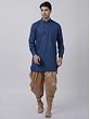 Elevate your ethnic elegance with the cotton blend kurta paired with the Patiala style rose gold dhoti. This ensemble strikes a harmonious balance between tradition and contemporary style, featuring a cotton blend kurta that exudes timeless charm. The Patiala style rose gold dhoti adds a touch of regal flair, complementing the look with a playful twist. This set transcends ordinary attire, it’s a celebration of cultural richness and modern aesthetics, where the blend of fabric and the choice of rose gold create a statement of refined elegance suitable for a range of festive occasions or celebrations.