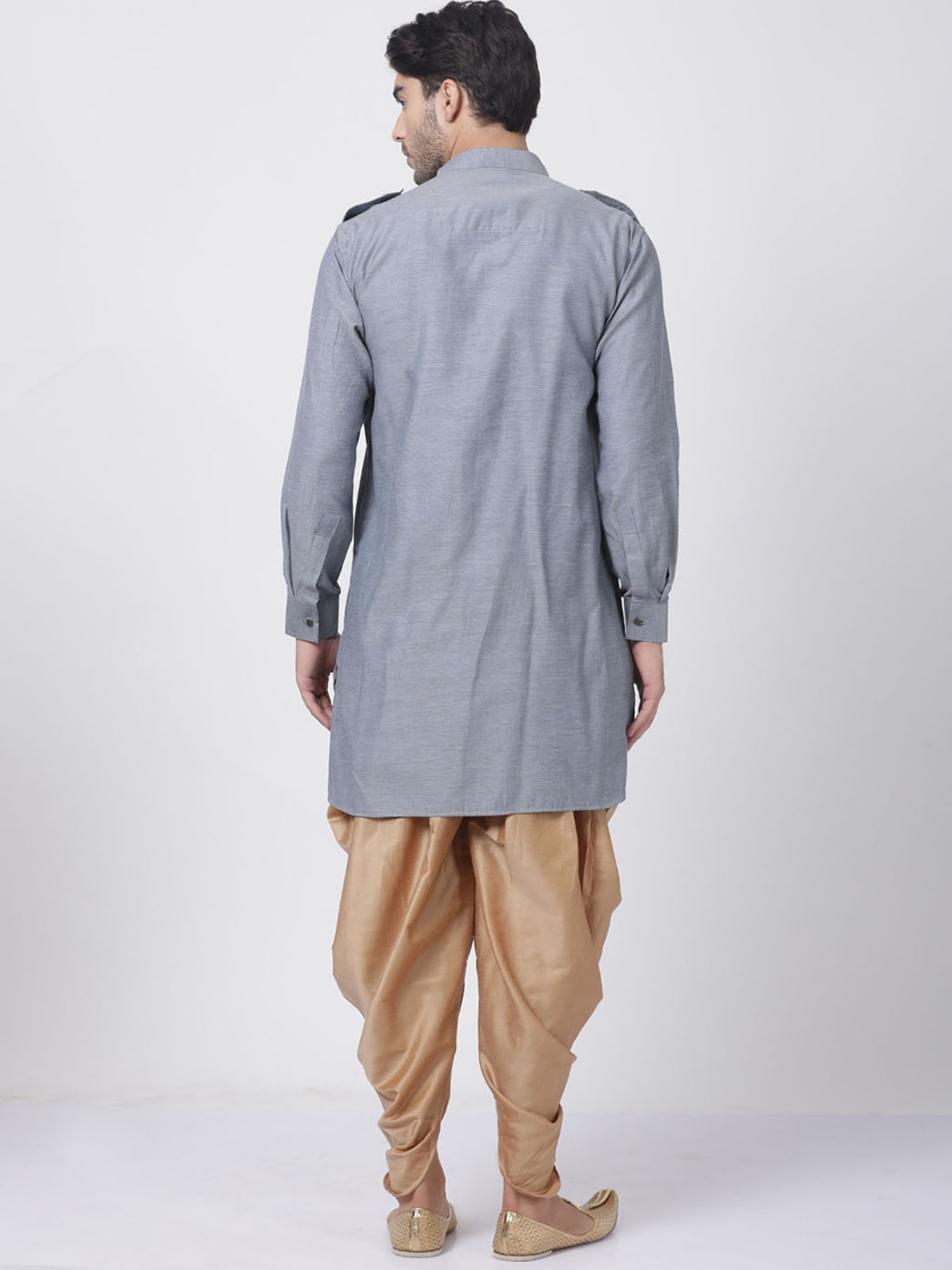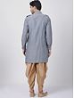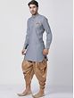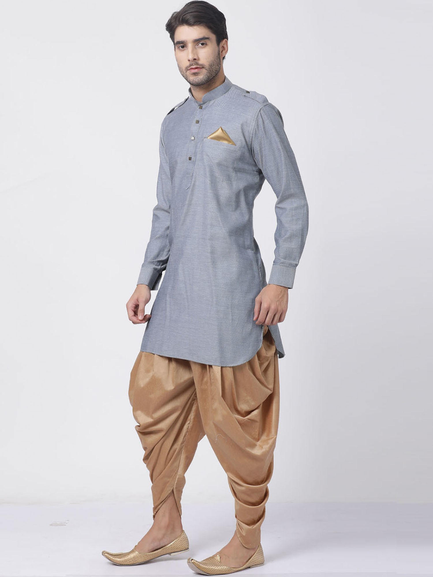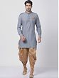 This Pathani Style Kurta with Patiala Style Dhoti is a stylish and comfortable ethnic ensemble. Crafted from a high-quality cotton blend fabric, this royal attire represents the rich tradition and craftsmanship of India. Exuding simplicity and masculinity, the Pathani Style Kurta is known for its straight-cut silhouette, buttoned placket, and full sleeves. Often, it features a Mandarin collar which adds a touch of sophistication. Paired with the Cowl Pattern Patiala Style Dhoti, this splendid outfit exudes ethnic charm. Dhoti’s unique draping style adds a contemporary twist to the traditional look. Offering a blend of elegance and ease, this ensemble is perfect for auspicious occasions.