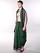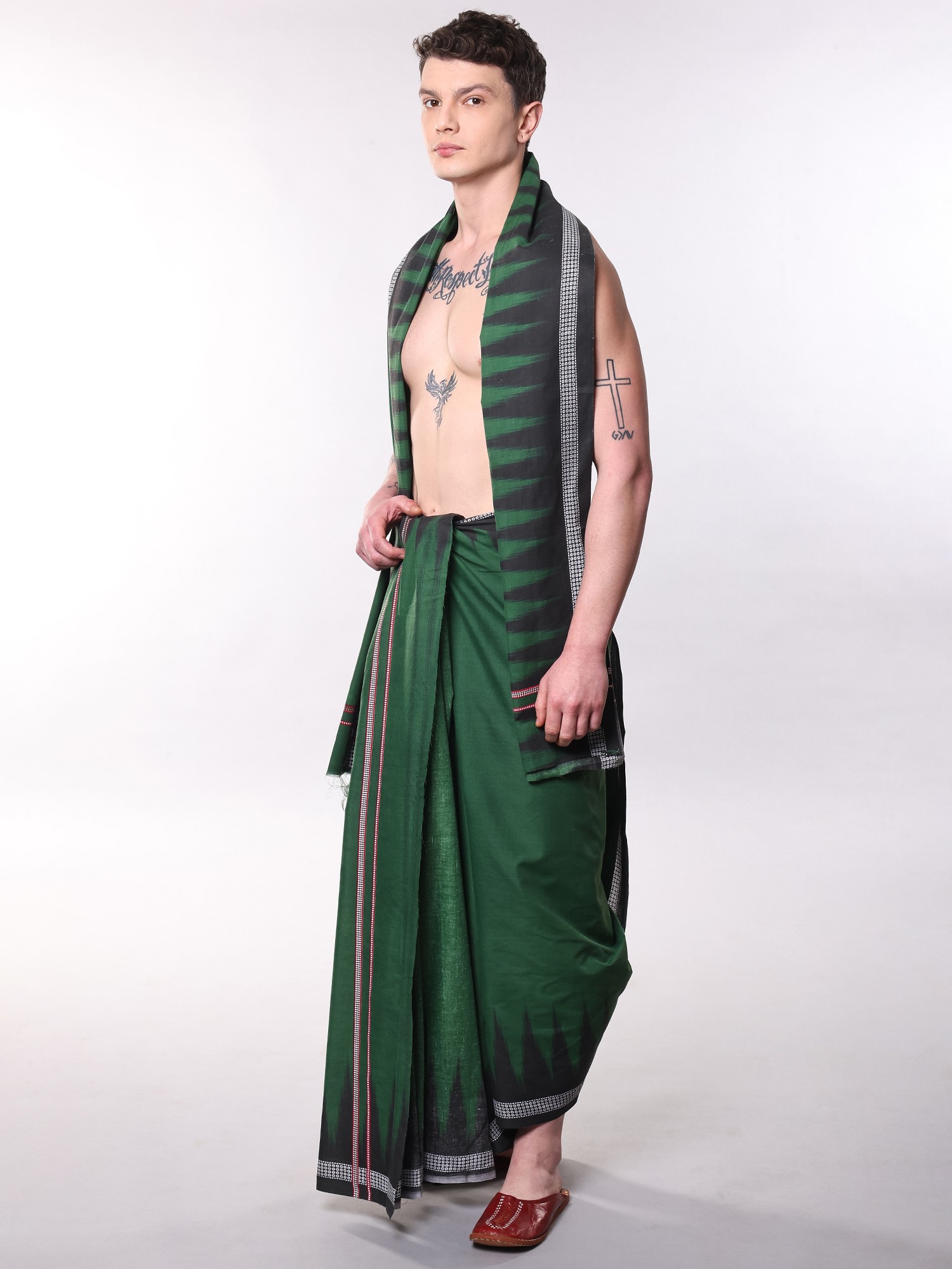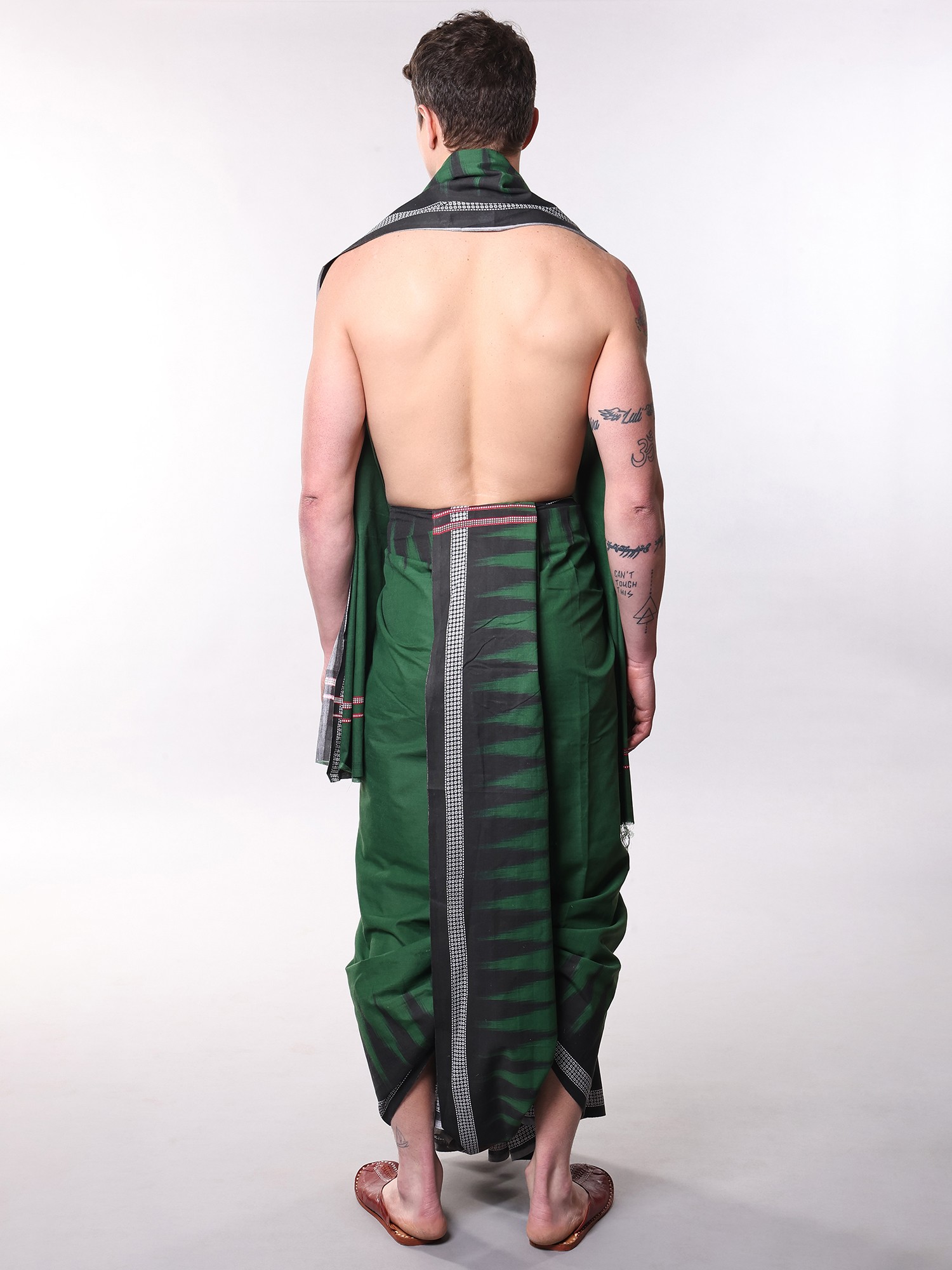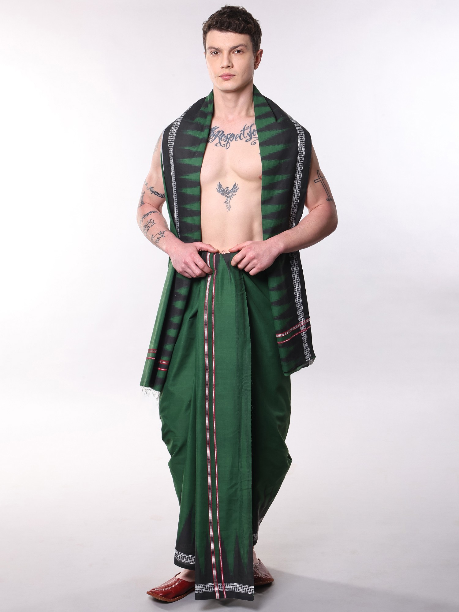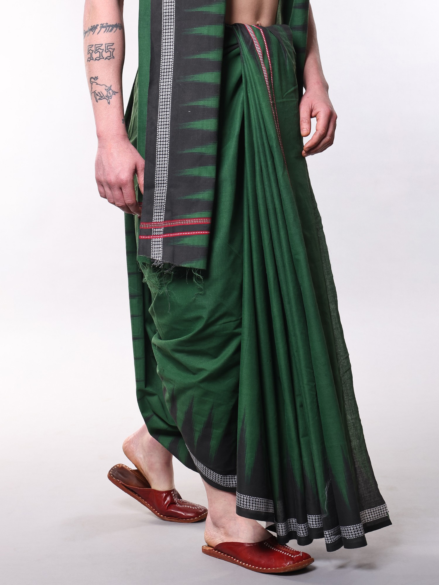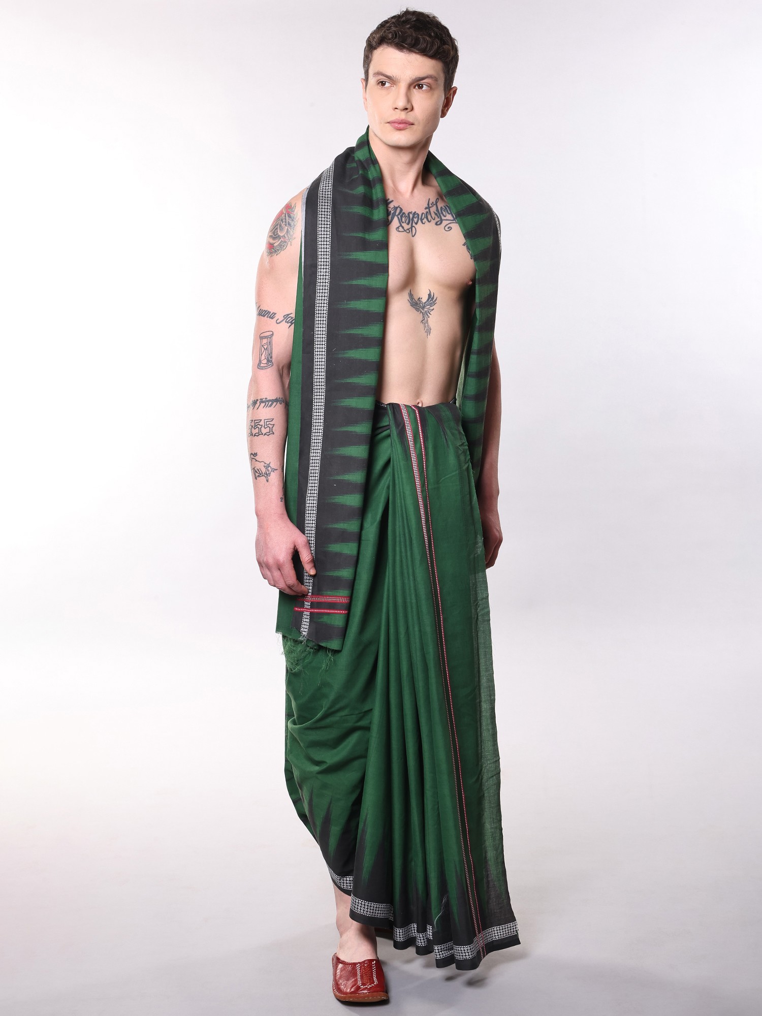 Features a vibrant green cotton dhoti, offering ample fabric for graceful draping.