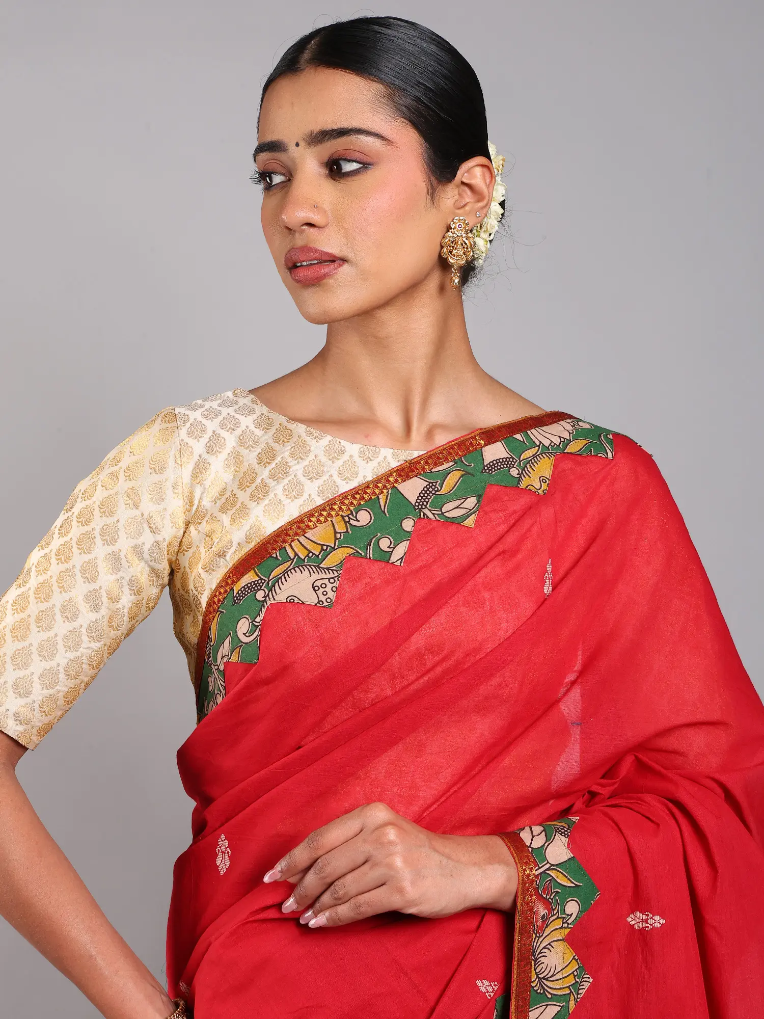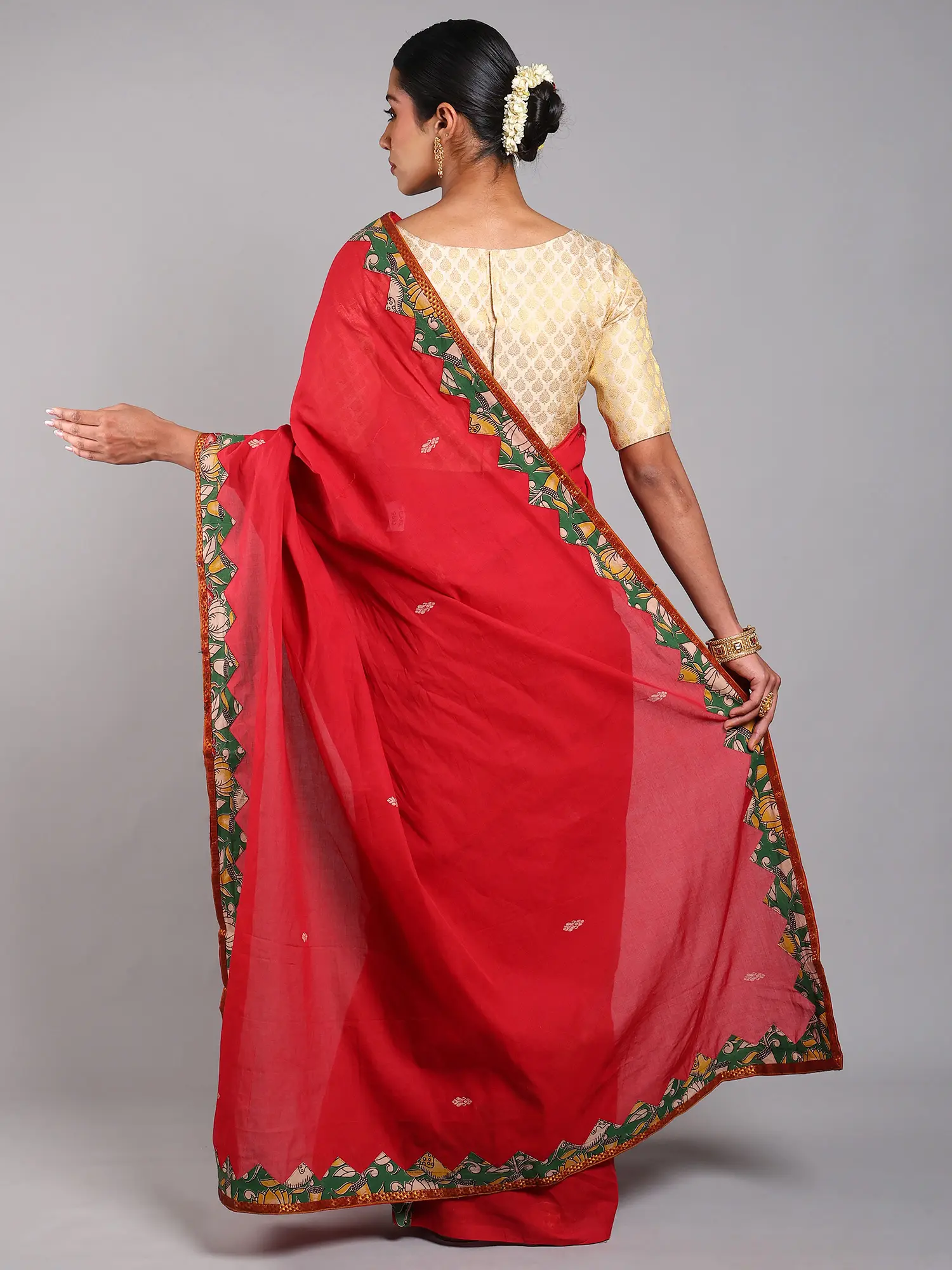 Fairway-Green Kalamkari Sari from Telangana with Goddess Holding Diyas on Anchal