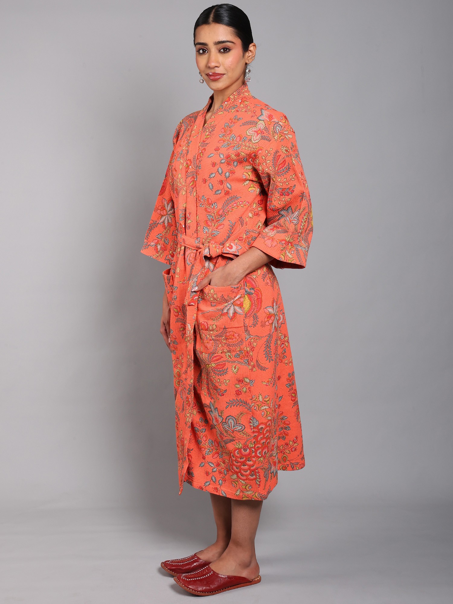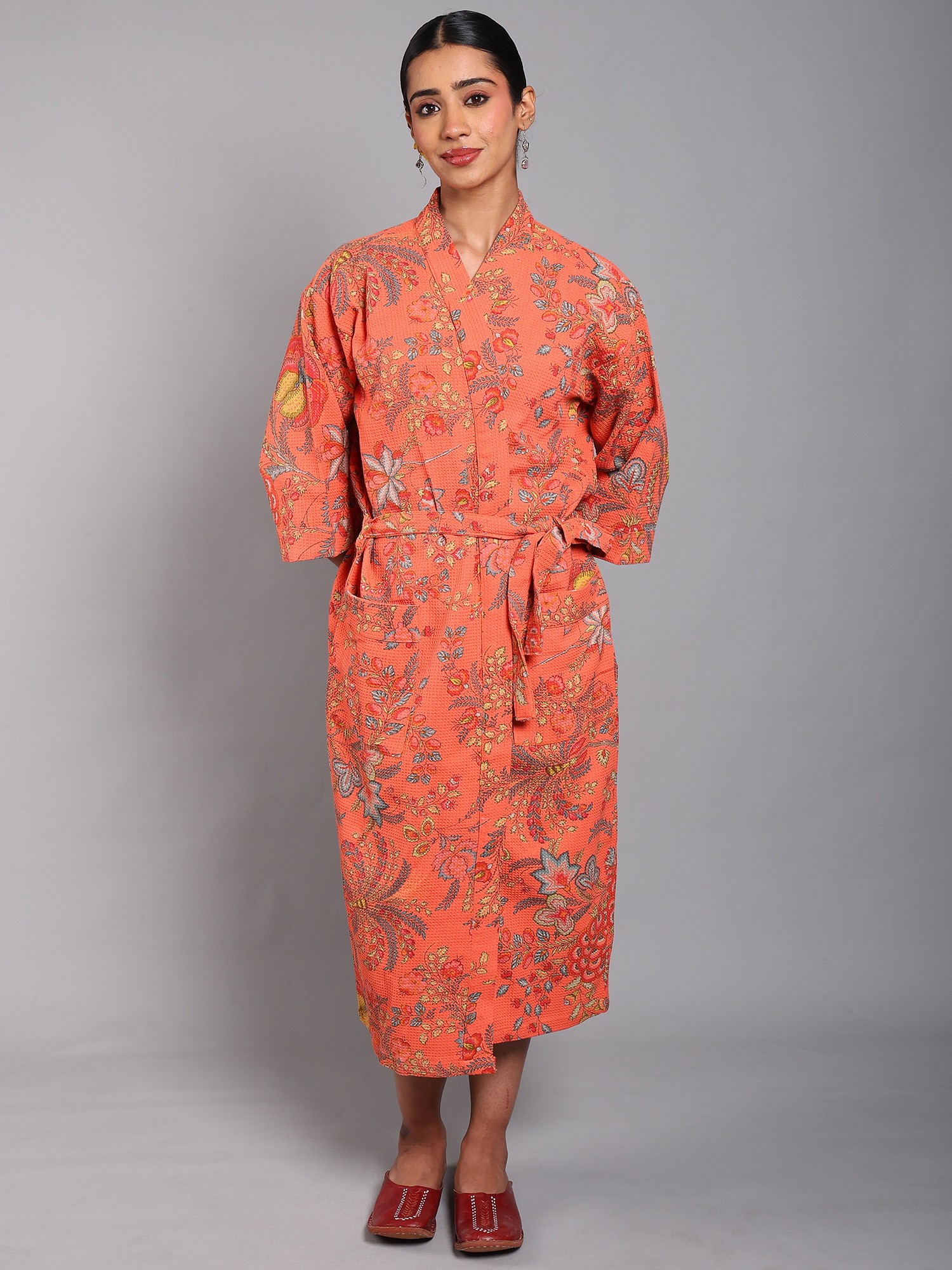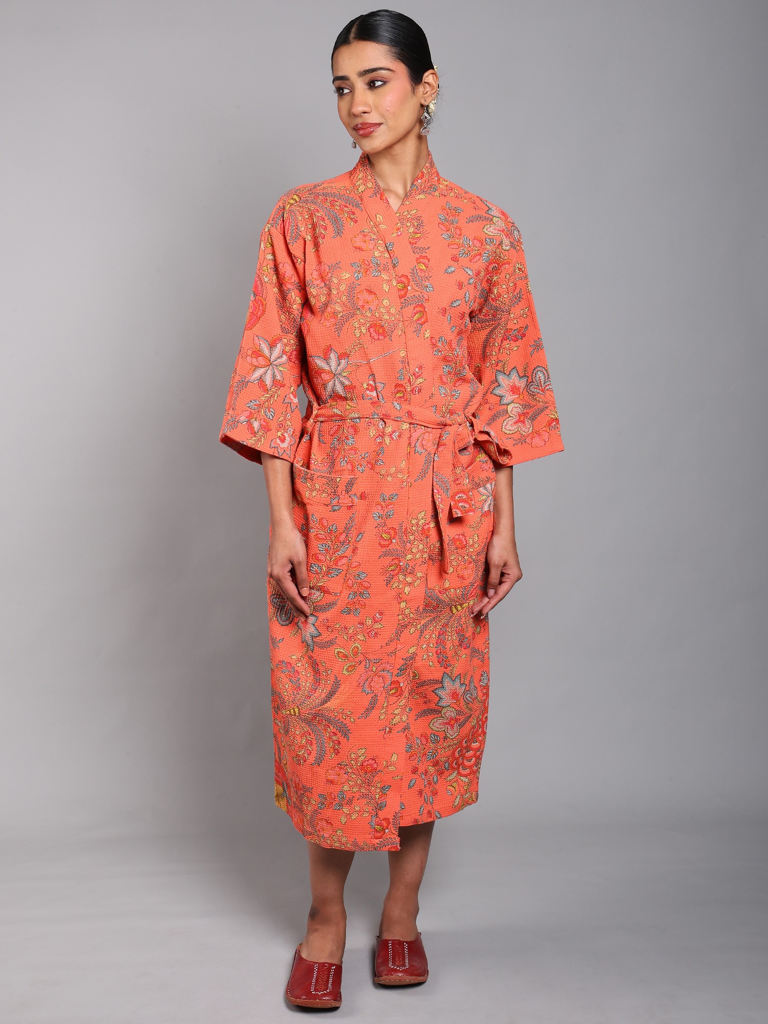 This robe is thoughtfully designed for both comfort and convenience. It features a classic wrap silhouette, allowing you to adjust the fit to your liking with a matching self-tie belt. The front pockets offer a practical place to keep your phone, remote, or other small essentials within easy reach. The loose, relaxed fit ensures freedom of movement, while the mid-length cut provides ample coverage. The 3/4 length sleeves offer practicality and freedom of movement.