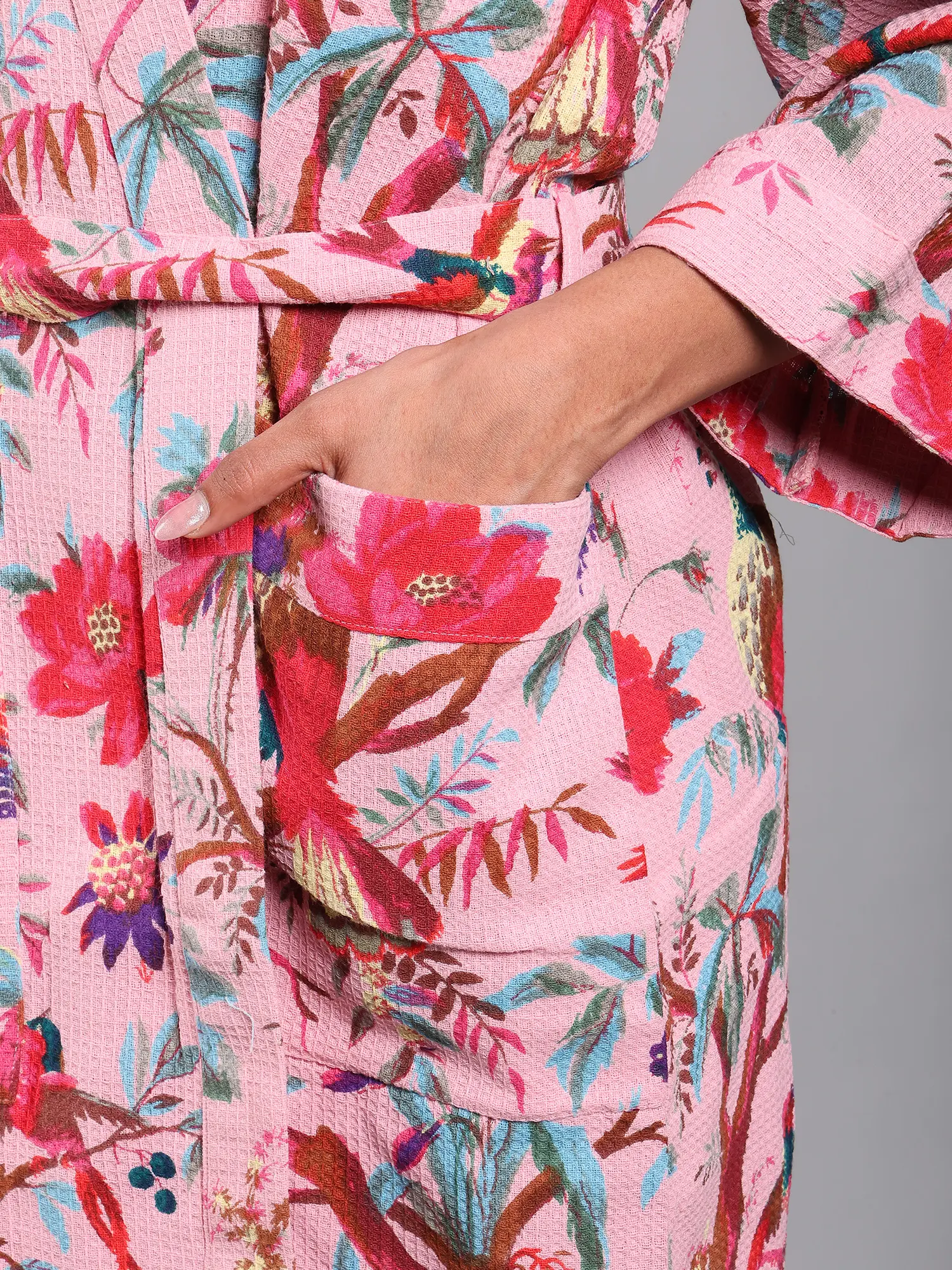 Wrap yourself in comfort and style with this delightful robe. The soft, breathable cotton fabric makes it perfect for lounging around the house, getting ready in the morning, or relaxing after a long day. The beautiful print, featuring birds perched upon delicate tree branches, adds a touch of nature-inspired charm to your everyday routine. The pastel pink backdrop is calming and adds a delicate feminine touch.