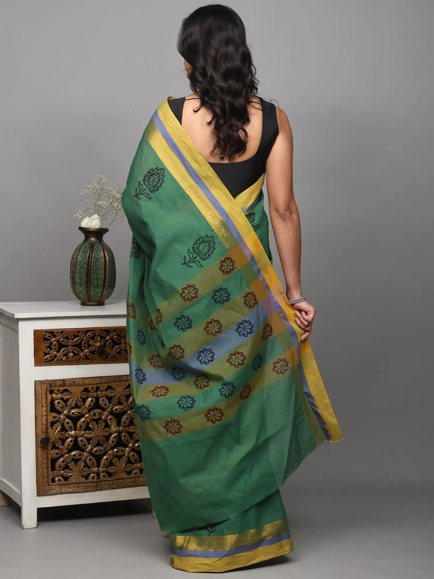 Marine-Green Block-Printed Sari from Madhya Pradesh with Florals All Over