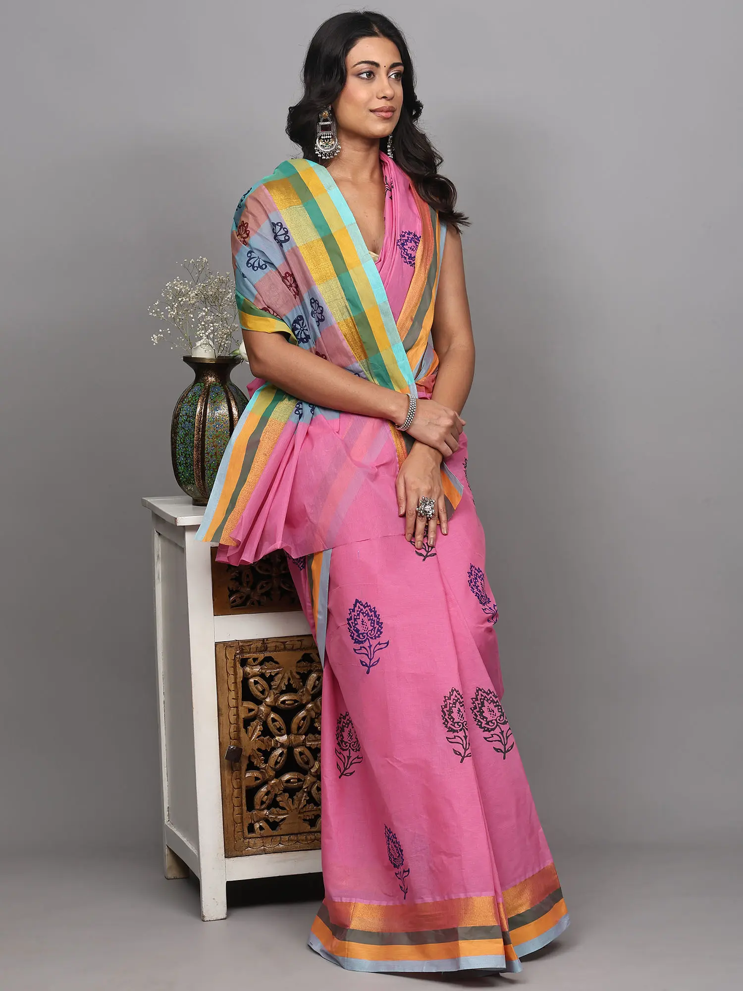 The beauty of this saree is further enhanced by its stunning border and pallu. The border features a captivating blend of colors, with bands of soft grey, vibrant orange, and a delicate sky blue, all accentuated by a shimmering zari thread that catches the light beautifully. This meticulous detailing creates a luxurious frame for the soft pink cotton. The pallu showcases a continuation of this elegant design, featuring a row of stylized floral patterns in complementary colors set against a pastel blue and pink checkered arrangement. This thoughtful combination of prints and borders creates a harmonious and eye-catching ensemble.