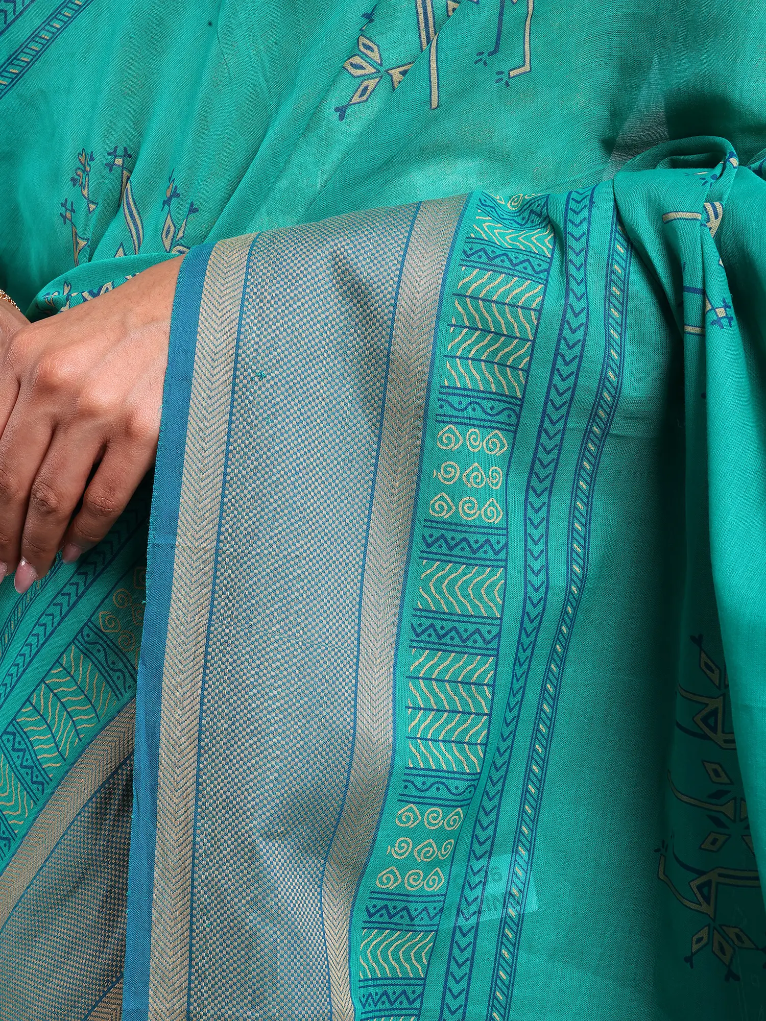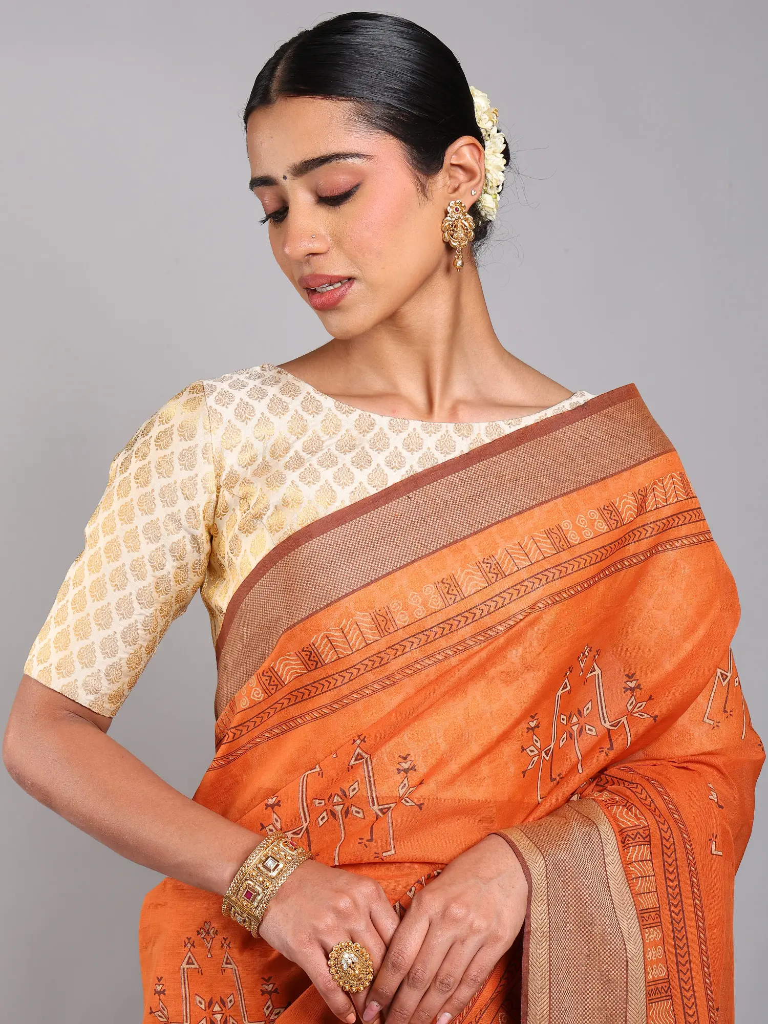 Cotton Saree with Block Printed Floral Motifs and Zari Border from Tamil Nadu