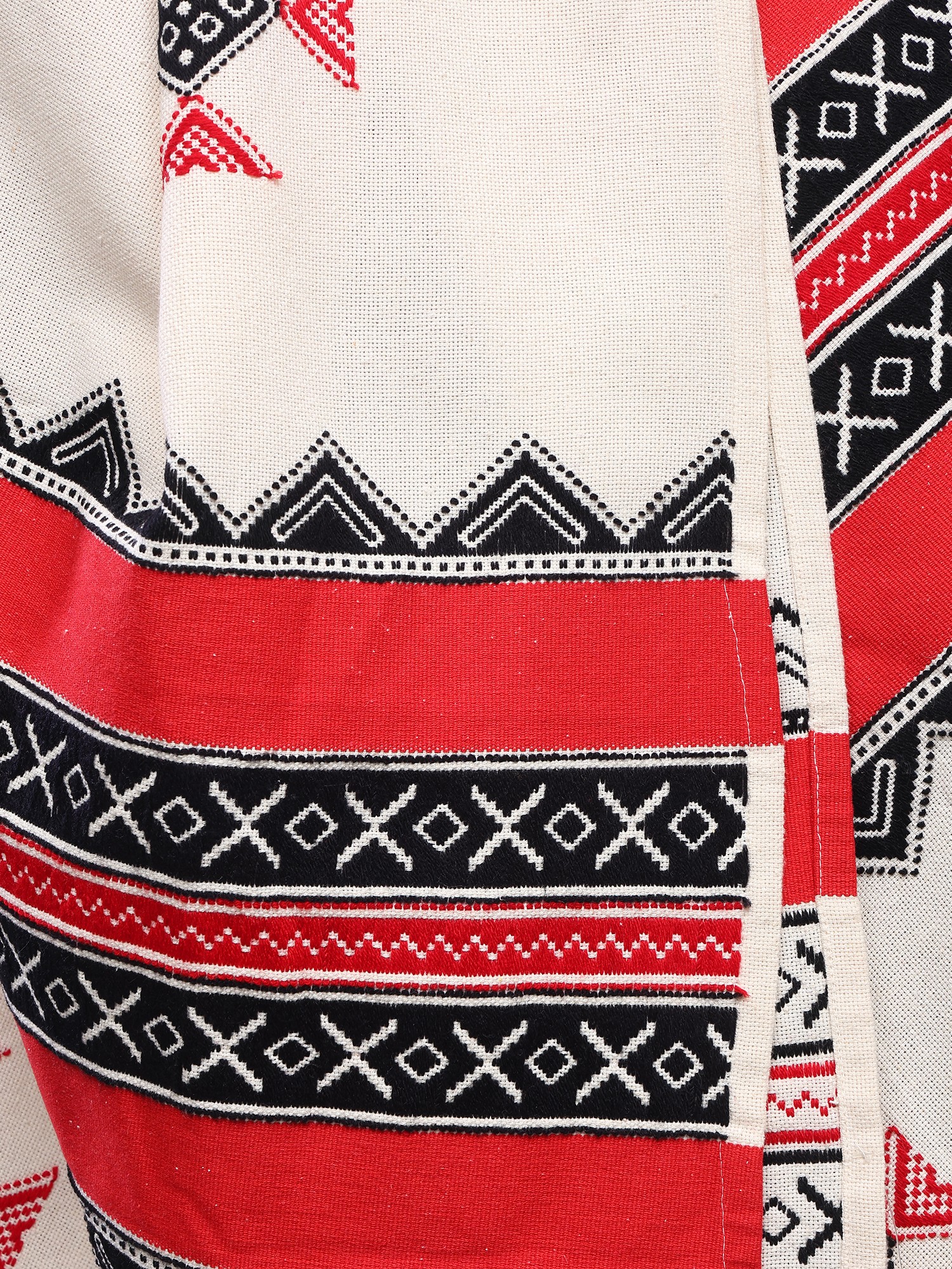 The distinctive embroidery gracing this shawl is a celebration of geometric patterns and symbolic motifs, meticulously hand-stitched by skilled artisans. The Toda people are renowned for their distinctive textile traditions, with embroidery forming a central element of their cultural identity. Each stitch on this shawl is a whisper of generations of artistic knowledge, translating into patterns that are both visually striking and deeply meaningful. The bold bands of red and black embroidery create a captivating contrast against the soft ivory base, drawing the eye to the intricate details. Small, stylized floral motifs interspersed throughout add a touch of delicate beauty, further enhancing the shawl's artisanal appeal. The characteristic geometric borders, with their precise lines and repeating shapes, are a hallmark of authentic Toda embroidery, showcasing the weaver's steady hand and artistic vision.