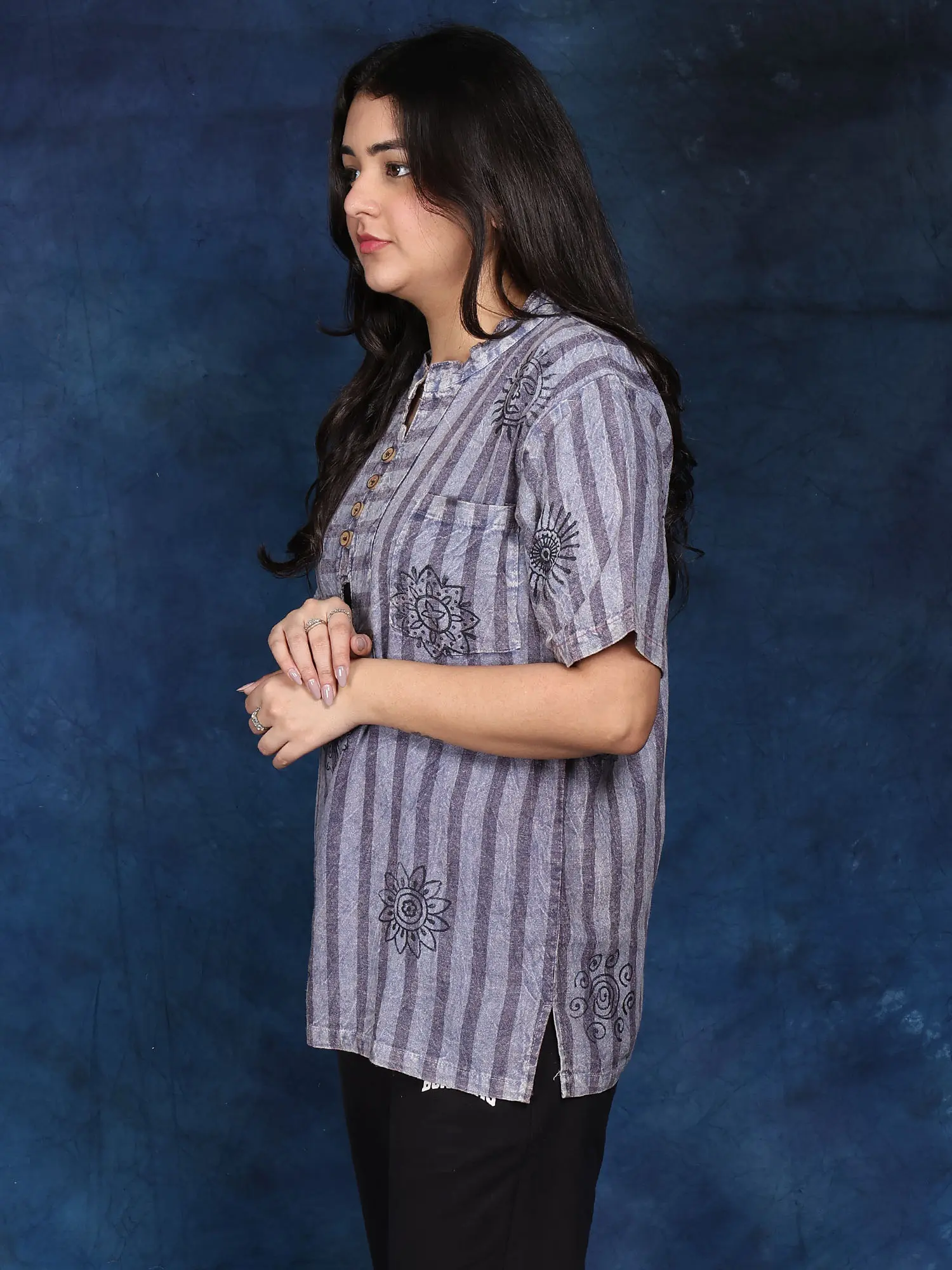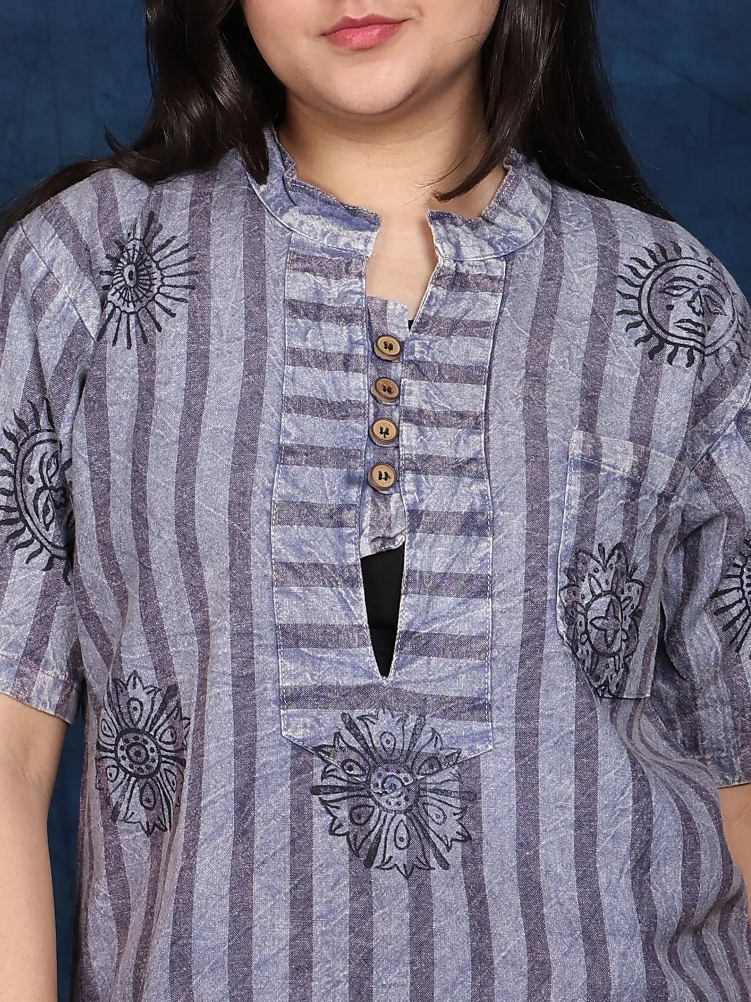 Indulge in the grace and comfort of our exquisitely designed cotton short kurti, adorned with auspicious Hindu symbols. This vibrant garment seamlessly blends traditional artistry with modern style, making it perfect for everyday wear or special occasions. The soft, breathable cotton fabric ensures all-day comfort, while the intricate print adds a touch of spirituality and elegance to your attire. This versatile piece will quickly become a staple in your wardrobe.