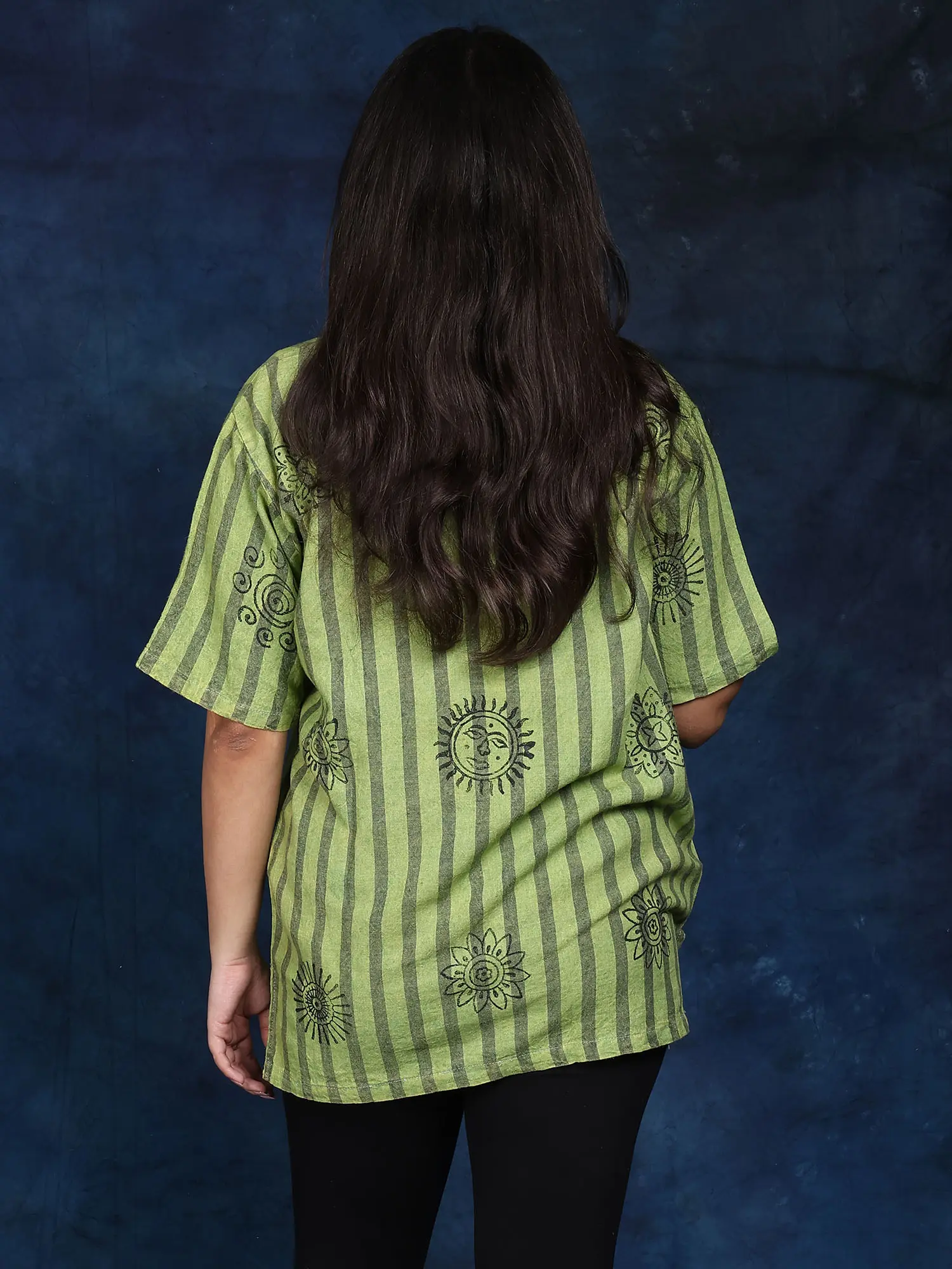 Beyond its spiritual and aesthetic appeal, this kurti is designed for practicality. A convenient front pocket adds functionality, offering a safe and accessible place to store small essentials. The simple button-down neckline provides a classic and timeless look, and the light, airy cotton fabric will keep you cool and comfortable no matter the season. The carefully constructed seams ensure the kurti maintains its shape and quality through repeated washings. The light, bright green color and subtle black stripes are designed to be flattering and versatile, making it a great choice for numerous outfits and occasions.