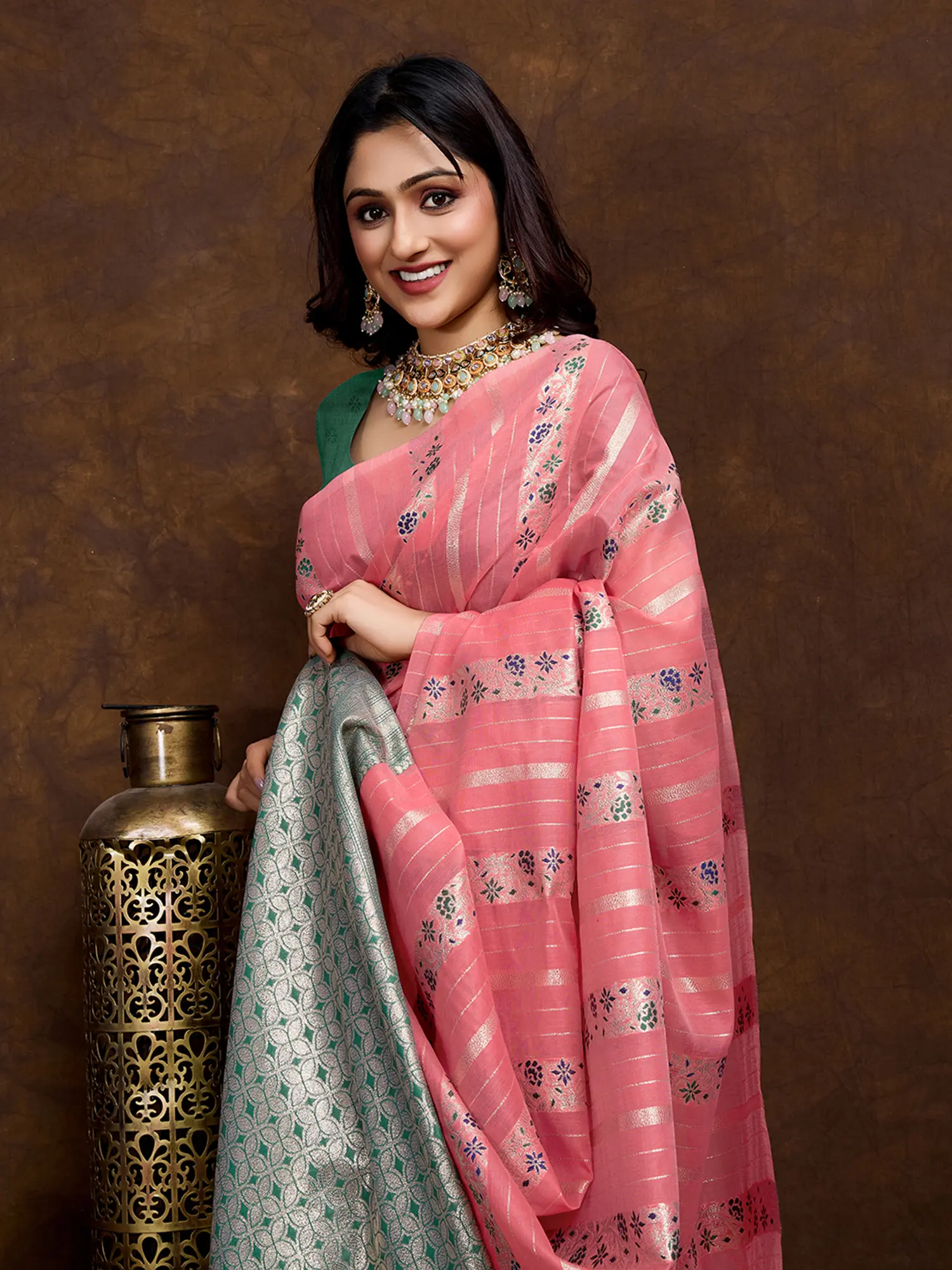 Step into a world of refined style with this exquisite cotton silk saree, a masterpiece designed to capture attention at any celebration. The vibrant green fabric is adorned with a delicate all-over stripe pattern, interspersed with charming floral motifs in a soft pink hue. These intricate details are woven with precision, adding a touch of subtle artistry that speaks volumes. The interplay of the refreshing green and the gentle pink creates a harmonious visual appeal, making this saree a truly captivating choice.