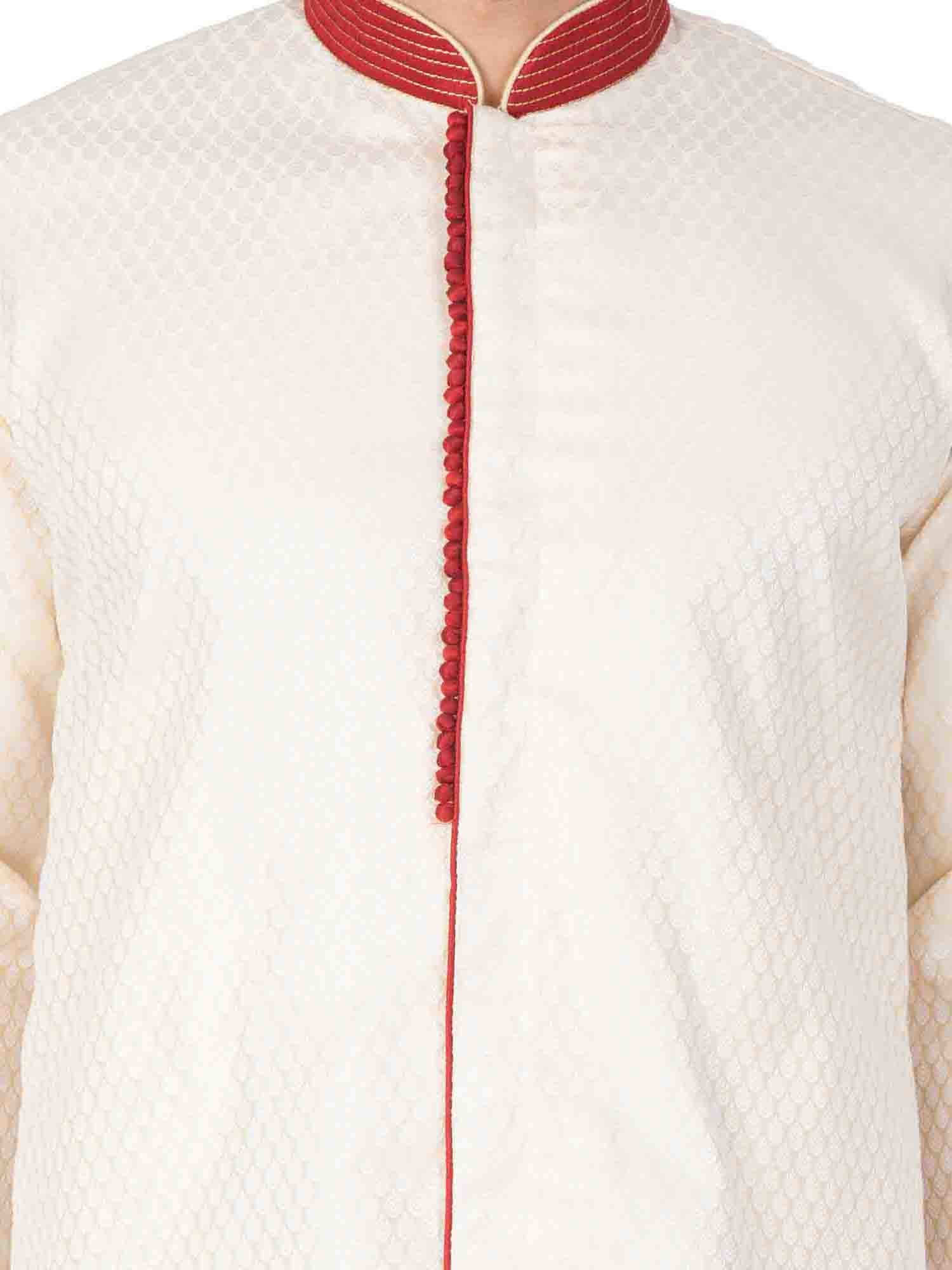 This classic outfit is a resplendent fusion of tradition and modernity, a symphony of elegance and innovation. Crafted from a luxurious silk blend, it drapes the wearer in sheer opulence, caressing the skin with a gentle embrace of comfort. The drop pattern adorning this masterpiece is a testament to meticulous craftsmanship, a cascade of intricate motifs that narrate stories of heritage. This sherwani epitomises the essence of “Indo-Western fashion”, seamlessly blending the timeless charm of Indian tradition with contemporary flair. A garment that transcends time, this sherwani is a sartorial masterpiece, a canvas of refined aesthetics, and a symbol of impeccable style.