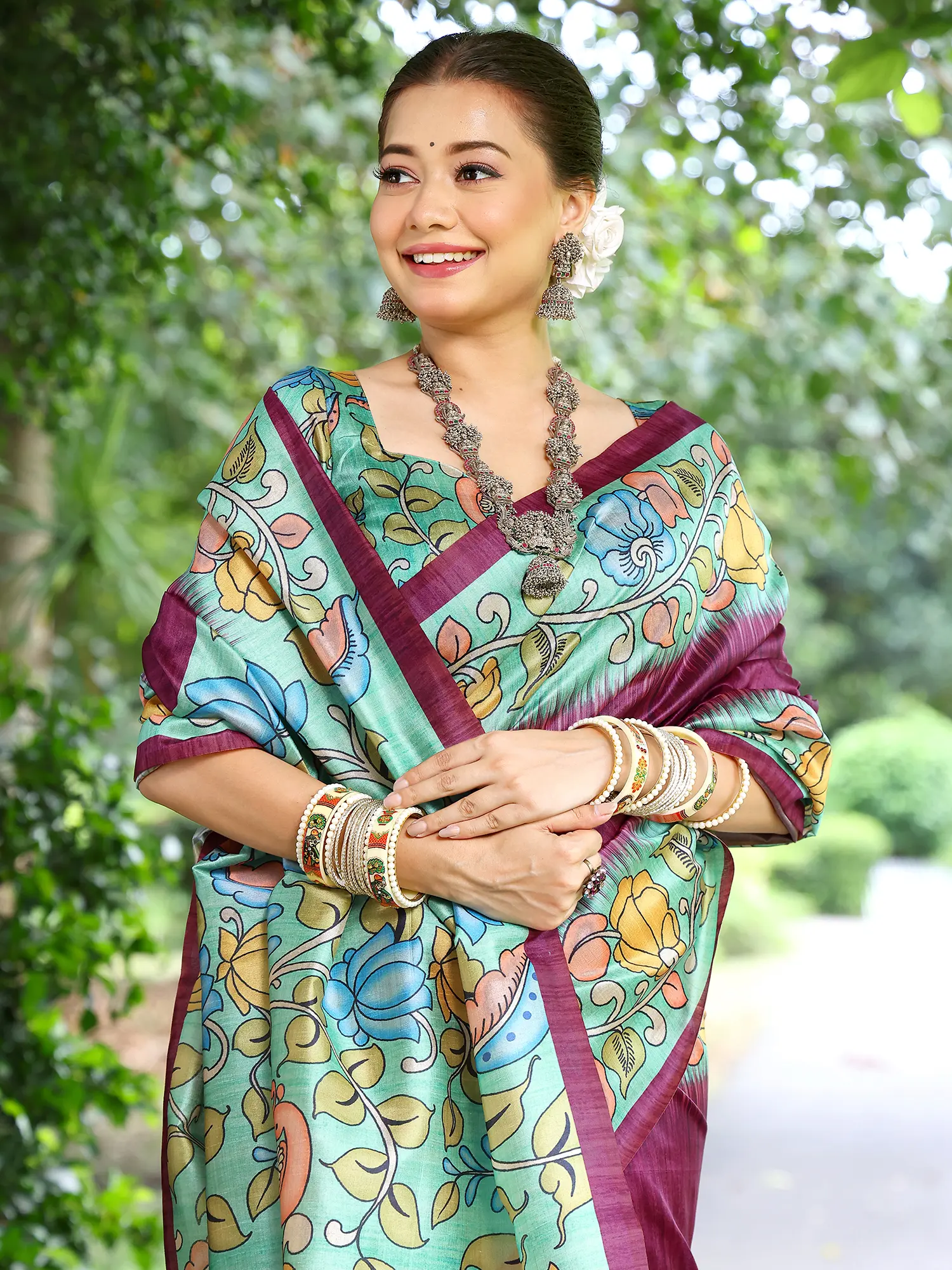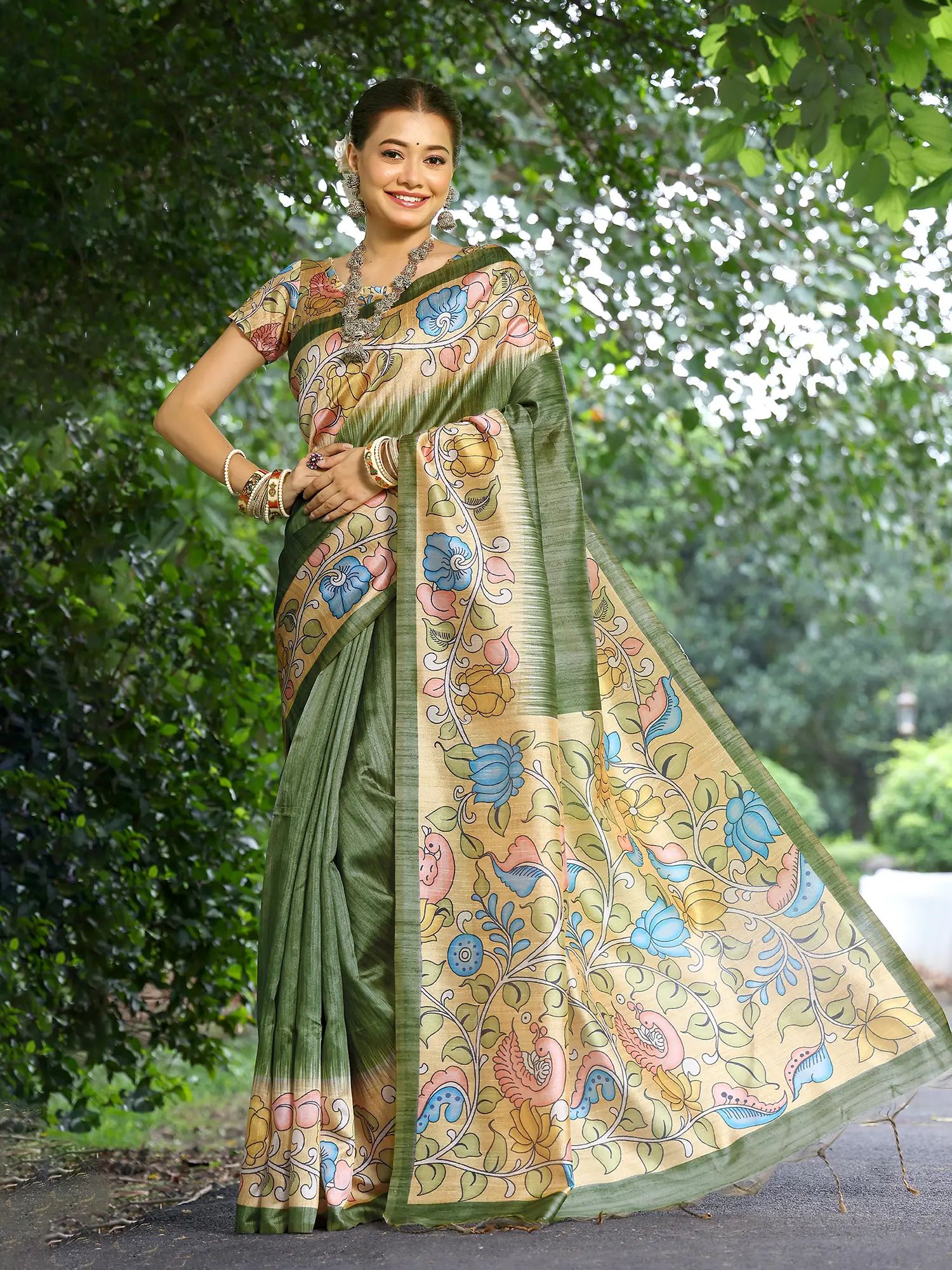 Vine Border and Floral Pallu Digital Printed Kani Polyester Saree with Shawl and Blouse
