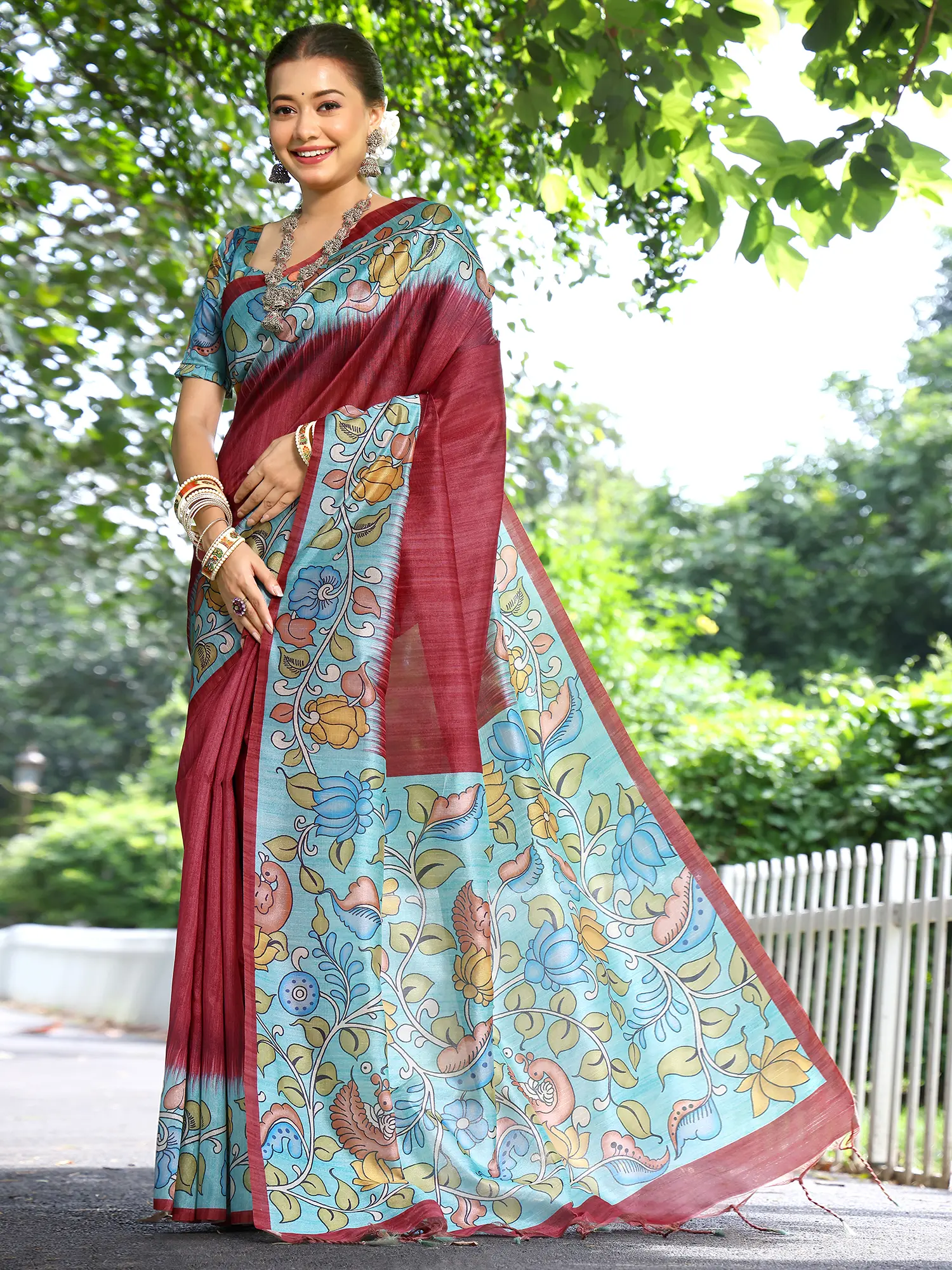 Digital Printed Kani Polyester Raspberry-Red Pallu Saree with Shawl and Blouse