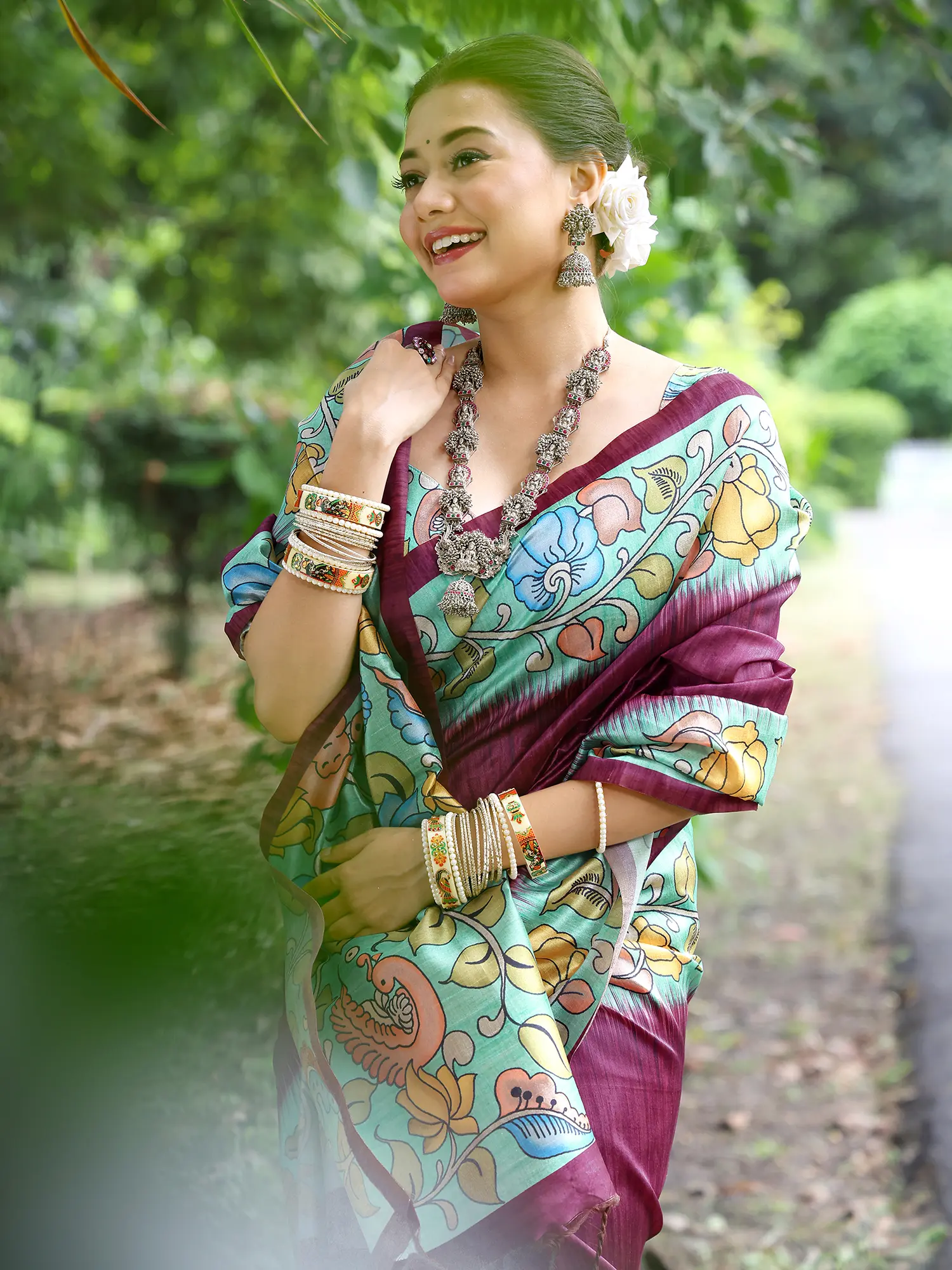 Wrap yourself in a tapestry of tradition and artistry with this stunning saree. A harmonious blend of cotton and silk creates a fabric that drapes beautifully and feels luxurious against your skin. This piece is more than just clothing; it's a celebration of timeless style and intricate craftsmanship. The subtle sheen of the blended fabric catches the light, adding a touch of understated glamour to your look.