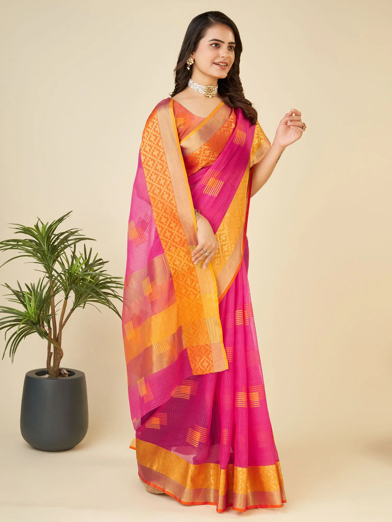 Silk Saree with Zari-Woven Border and Geometric Motifs All-Over