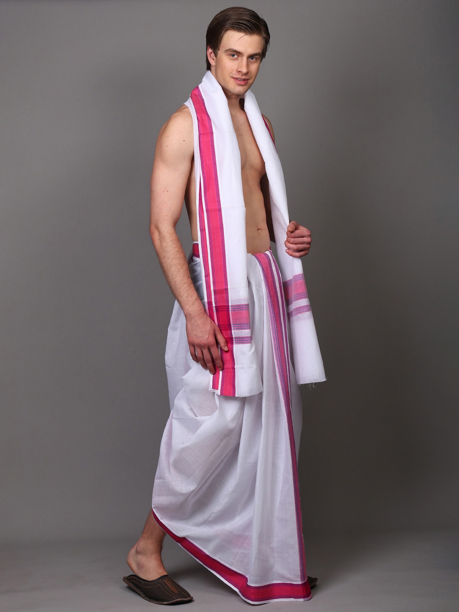 Cotton Traditional Dhoti with Angavastram Set and Contrast Pink Border