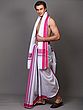 The pristine white of the dhoti and angavastram serves as a canvas for the striking contrast pink border. This thoughtful detail adds a touch of vibrancy and sophistication, elevating the traditional attire. The neatly woven pink stripes running along the edges of both the dhoti and the angavastram create a visually appealing pattern that is both classic and contemporary. The angavastram, traditionally worn draped over the shoulder, complements the dhoti perfectly, completing a look that is both dignified and stylish. This set is a testament to the beauty of simplicity and the power of subtle detailing in traditional Indian menswear.