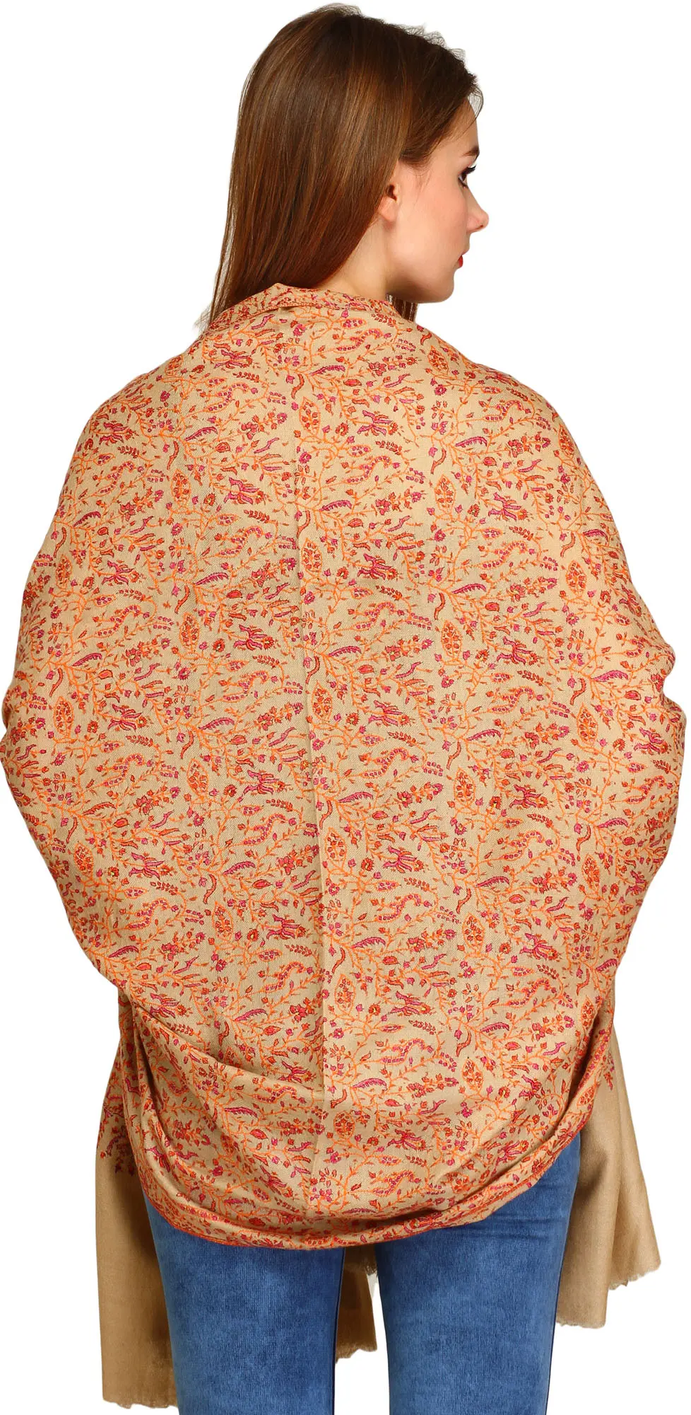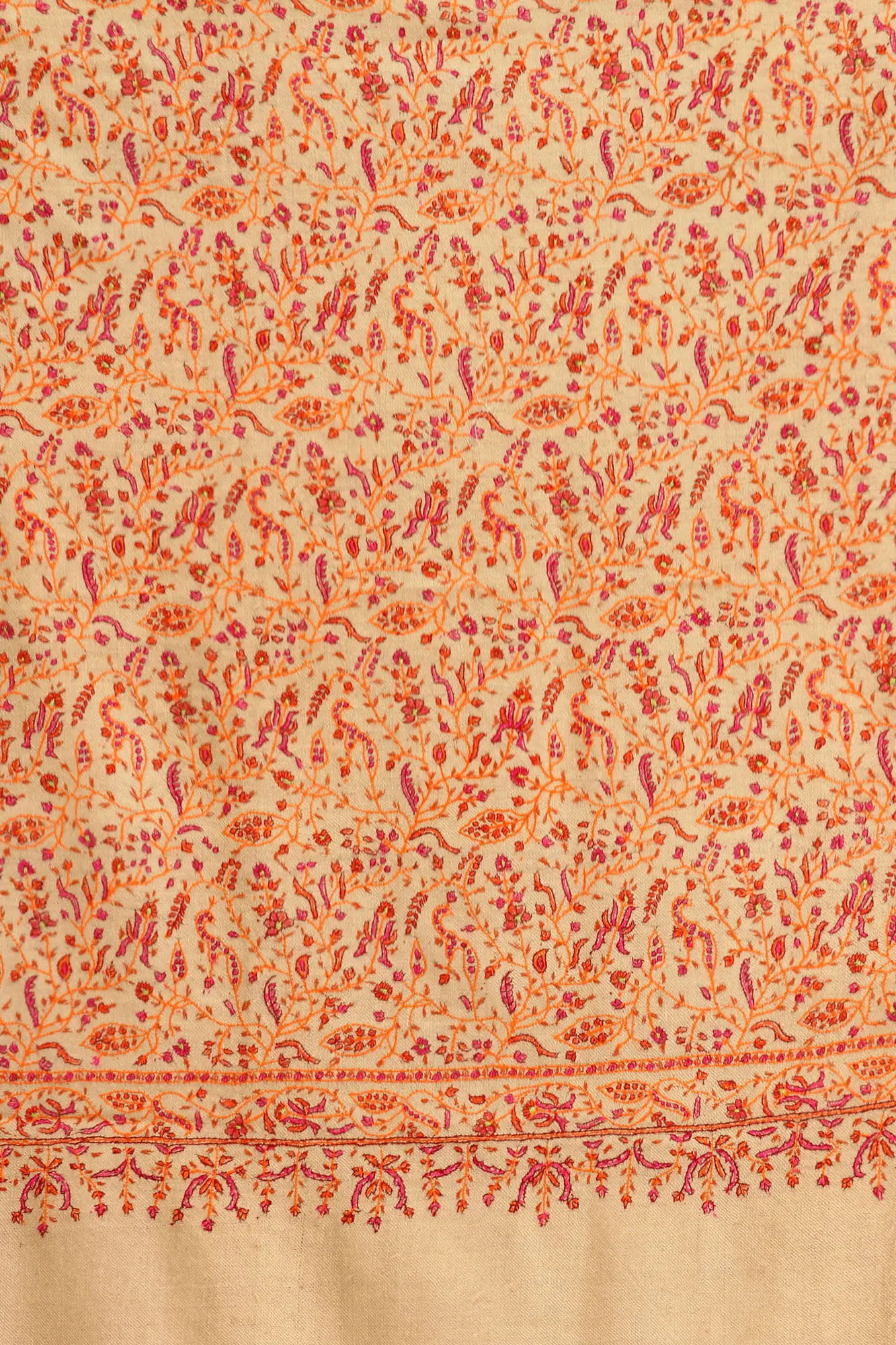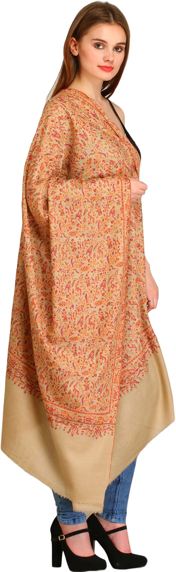 Cream Colored Pashmina Shawl with Sozni Floral Fine Embroidery and Rich Palla