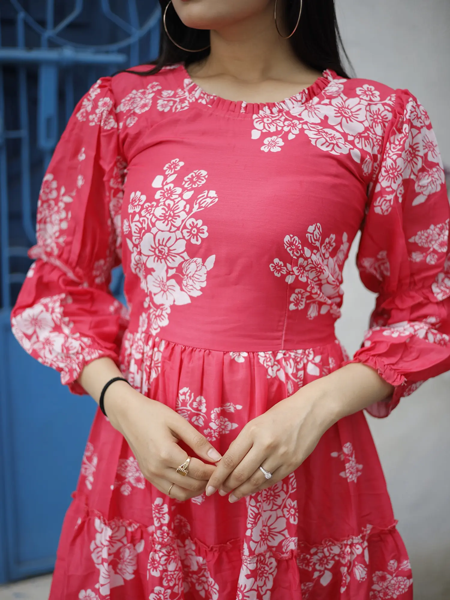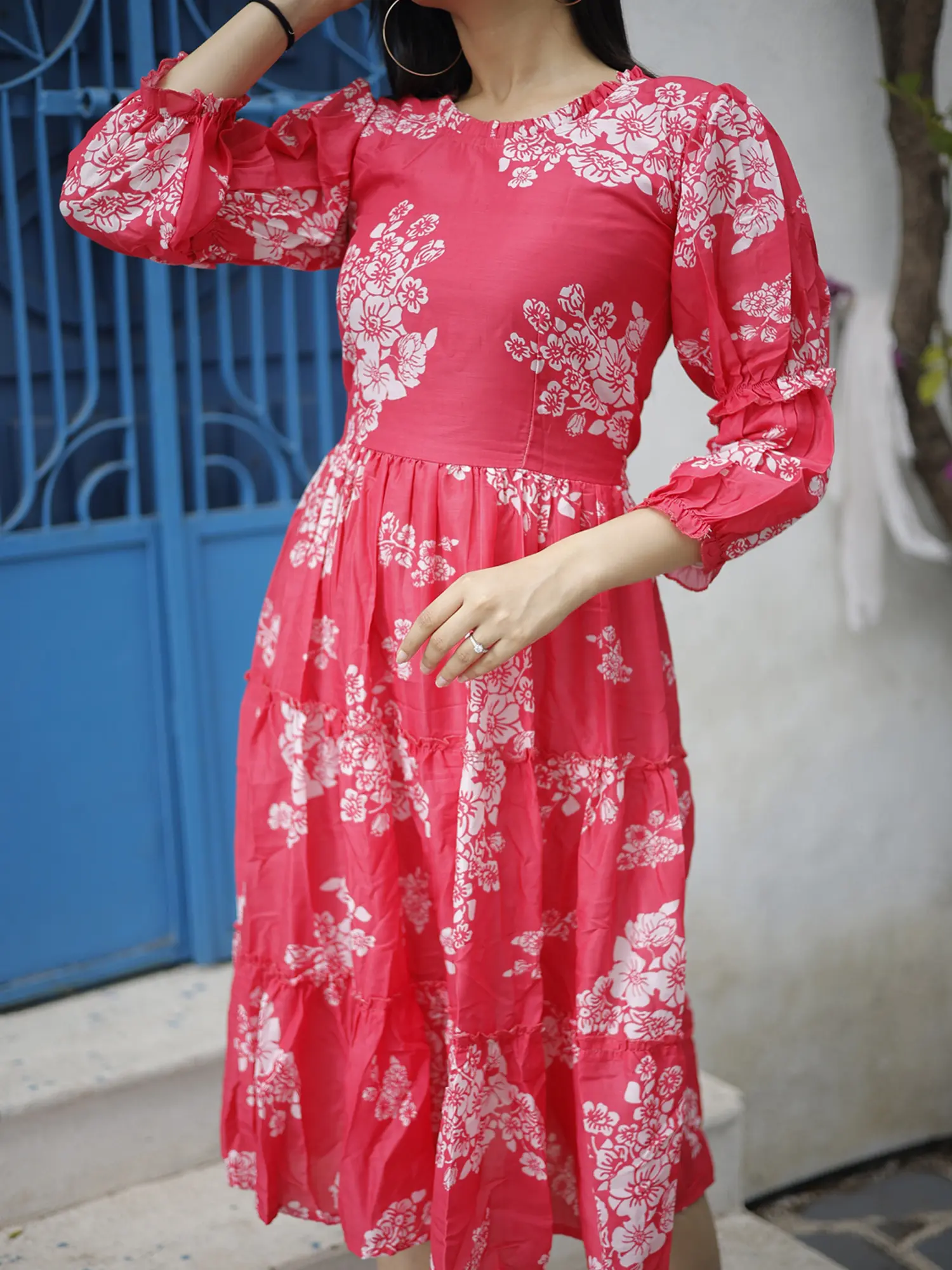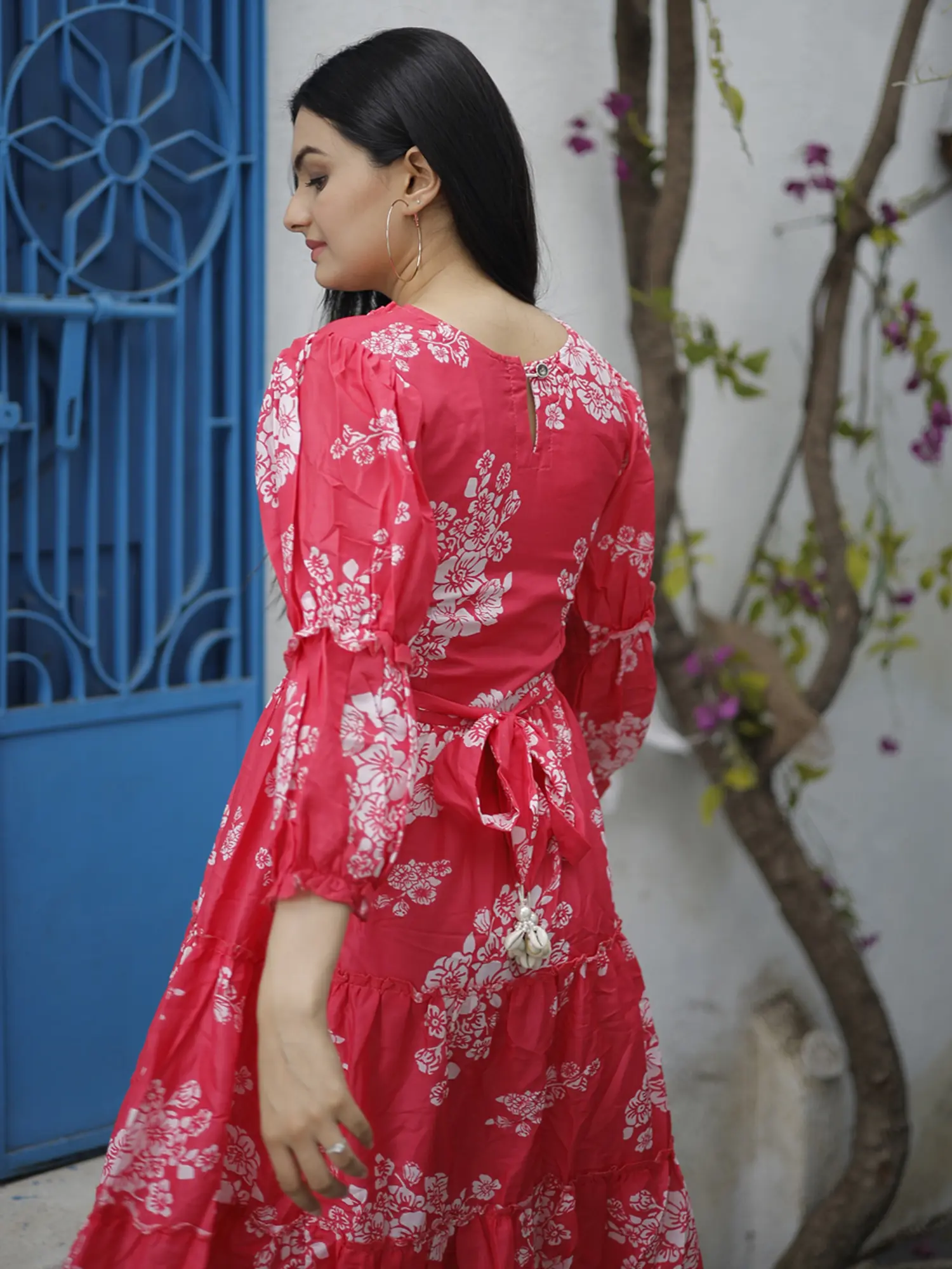Make a peppy and stylish statement this summer in this Cranberry Splash Digitally printed summer dress. Made with soft and flowy Muslin, the dress has a rich pink color contrasted by the blooming floral patterns all over.