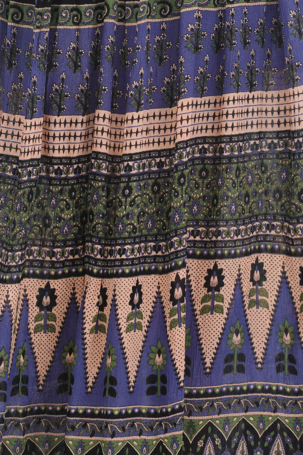 The true allure of this skirt lies in its captivating print. A rich tapestry of cream, blue, and green unfolds in a mesmerizing floral and geometric pattern. The intricate detailing of the motifs creates a visually stunning effect, drawing the eye with its artistic composition. Each stripe tells a story, blending delicate floral elements with bold tribal-inspired borders. This unique combination makes the skirt a statement piece that can elevate any casual outfit. The subtle cream background allows the vibrant blue and green hues to truly pop, creating a harmonious and eye-catching design.