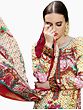 Three Piece Set Cotton Multicolor Kalka Printed Long Jacket With Silver-Grey Satin Crop-top And Pant