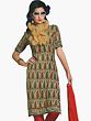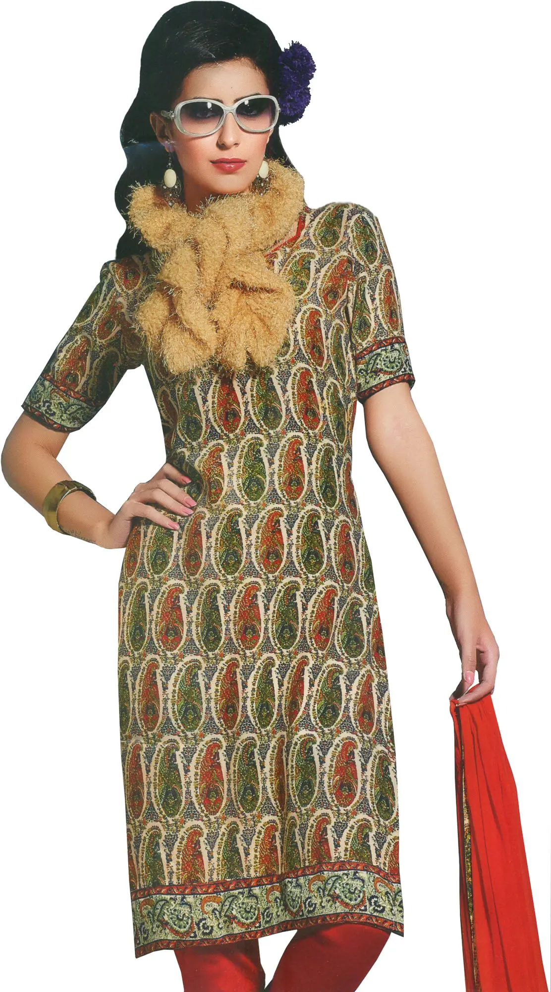 Step into a world of sophisticated style with this exquisite Choodidaar Kameez suit. The rich cream base of the kameez serves as a captivating canvas for the meticulously rendered paisley print. This timeless motif, rendered in a harmonious blend of vibrant oranges, earthy greens, and subtle cream accents, exudes a sense of classic beauty and intricate artistry. The paisley pattern flows gracefully across the fabric, creating a visually striking and undeniably fashionable statement.