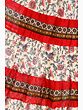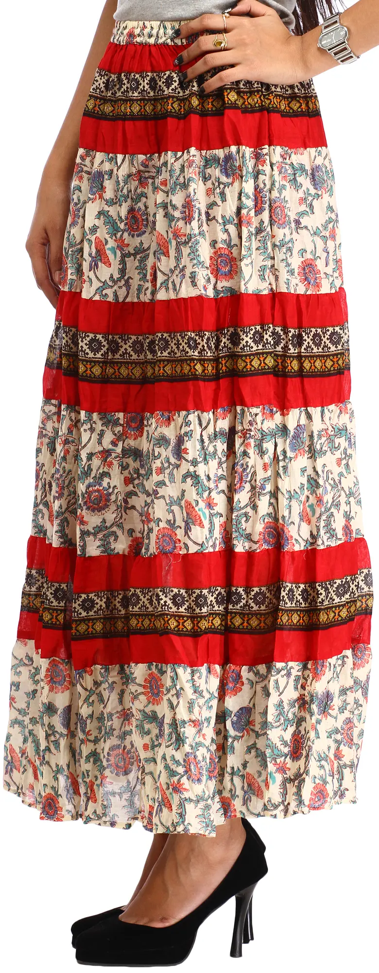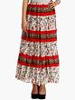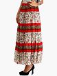 The skirt features a captivating design, boasting a creamy base adorned with a delicate floral print. The intricate patterns of blooming flowers in hues of red, blue, and green create a visually rich tapestry that exudes bohemian charm. This eye-catching print is further enhanced by bold red tiered panels, adding a striking contrast and a touch of playful vibrancy. Between the red bands, you'll discover a beautifully detailed trim with a geometric pattern in earthy tones, adding an artisanal touch and elevating the overall aesthetic. This thoughtful combination of prints and colors makes this skirt a true statement piece.
