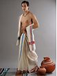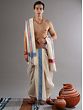 This cream-colored pure cotton dhoti-veshti drape is the epitome of simple yet elegant charm. This cotton set comes with a light blue and red Ganga- Jamuna handwoven border. The bright-cream color radiates purity and sophistication, while the intricately woven border adds a touch of regal finesse. The cream hue offers a versatile and timeless appeal, allowing you to pair it effortlessly with a variety of shirts or kurtas. The entire look for the attire is very elegant and makes it a perfect fit for traditional occasions.