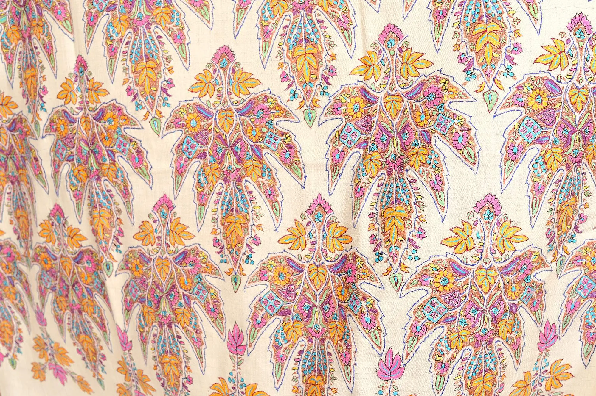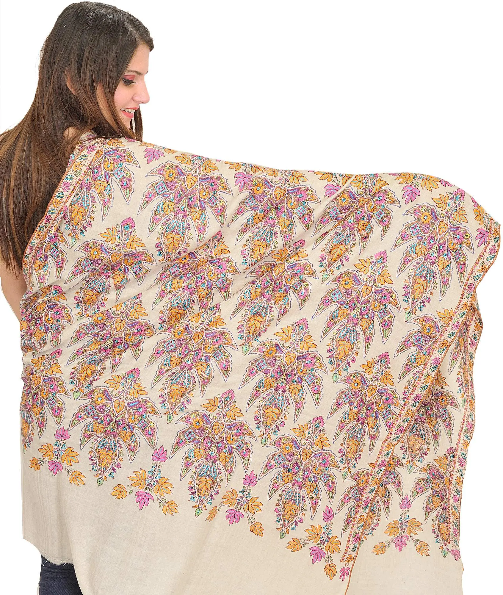 A lovely balance of hushed and vibrant tones, this pure Pashmina shawl allures one with its contemporary style of bold and rich patterns. The hand-woven shawl has a light cream shade field, on which the traditional maple leaf pattern, has been embroidered with an exquisite twist, by combining several miniature floral patterns inside the outline of the leaf. Luxurious to drape and beautiful to behold, you simply cannot afford to not possess this piece in your wardrobe.