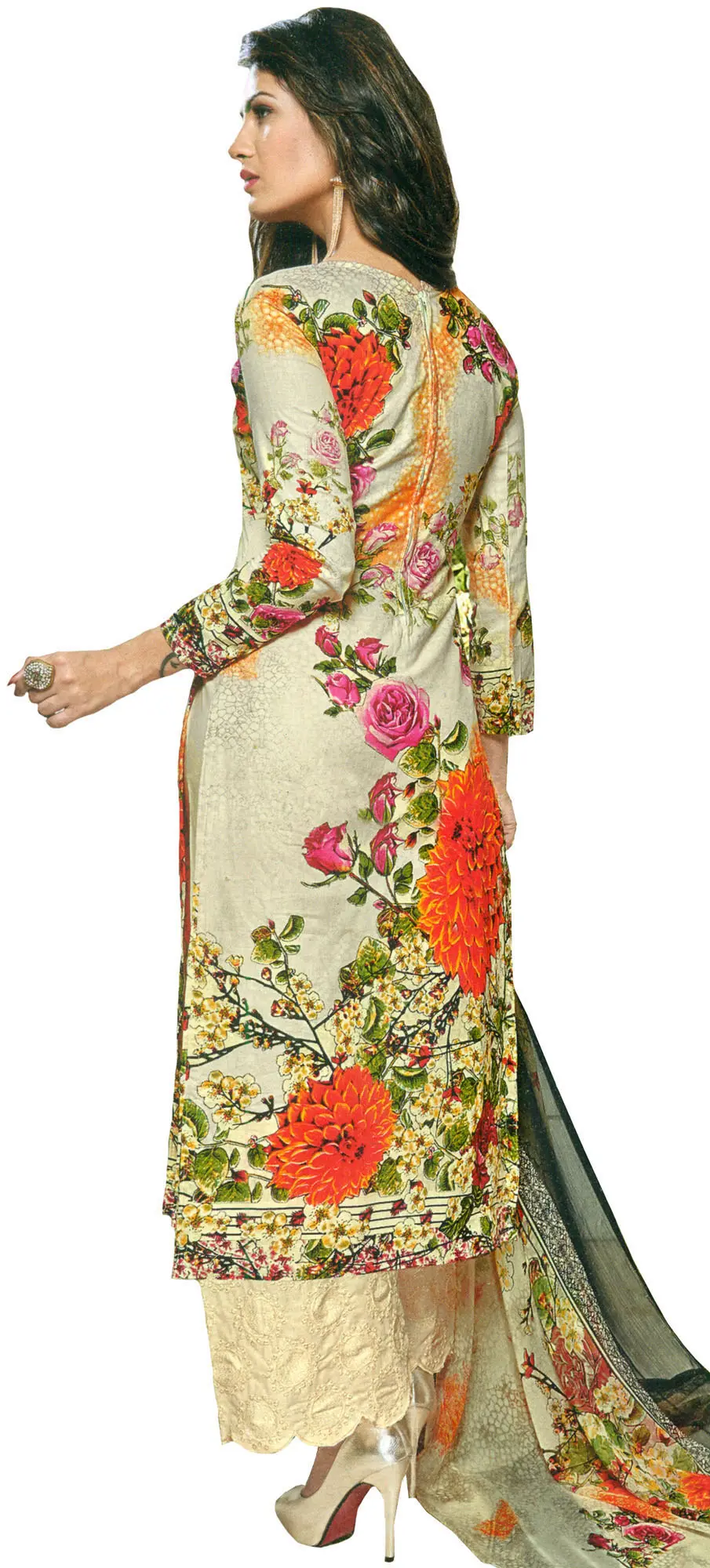 Step into a world of vibrant beauty with this exquisite salwar suit, designed to make a statement. The ensemble features a graceful, long-line kameez crafted from pure cotton, ensuring breathability and comfort throughout the day. The fabric is adorned with a stunning and intricate floral print, featuring a captivating blend of roses in soft pinks and bold oranges, interspersed with delicate blossoms and lush greenery. This lively pattern cascades across the cream base, creating a visually rich and eye-catching design.