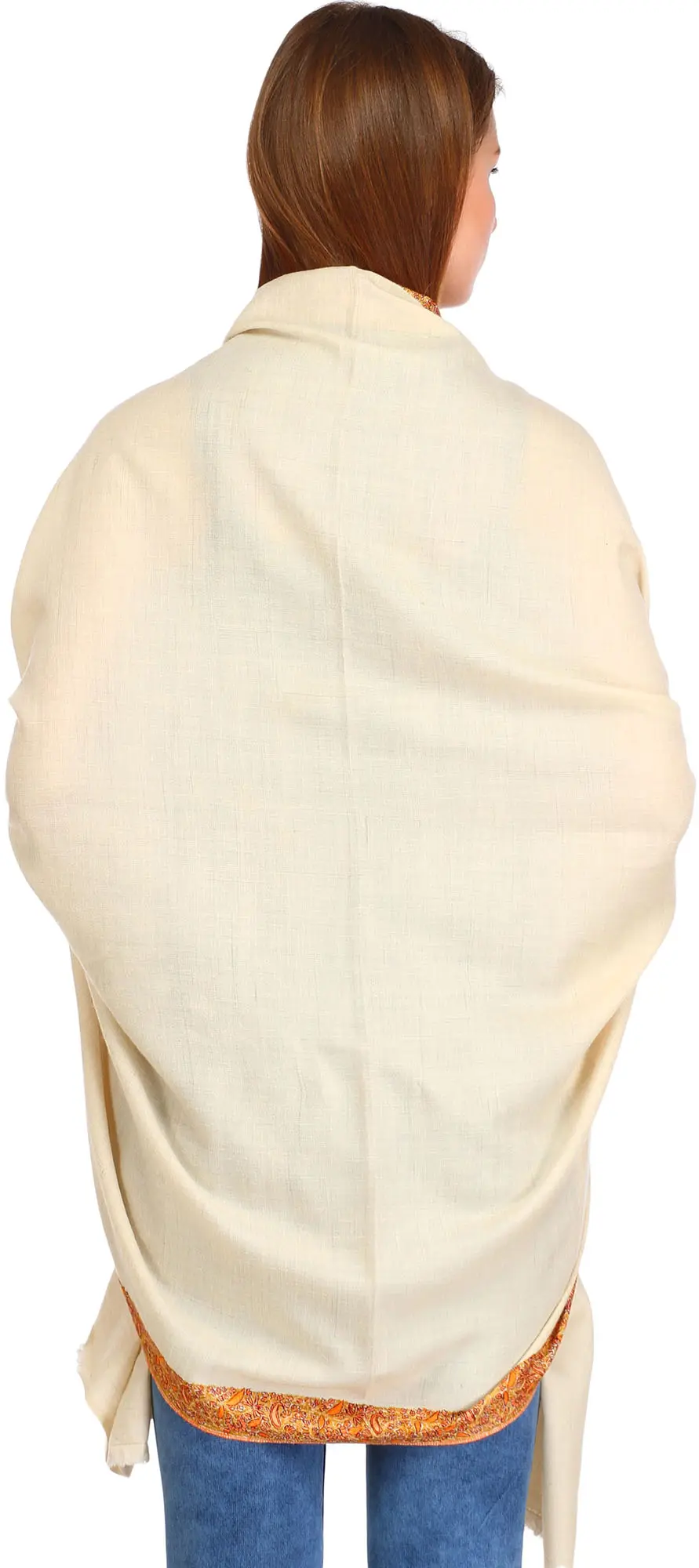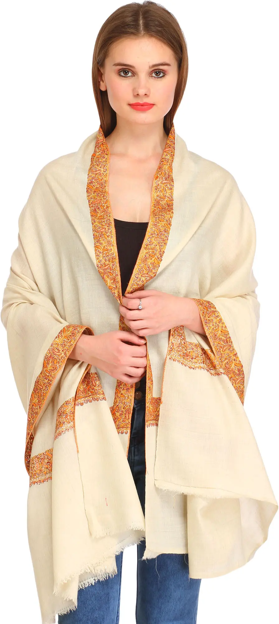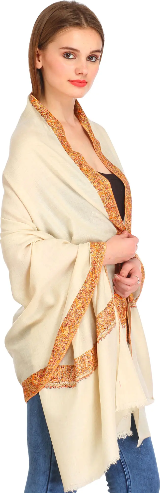 Aragon Plain Pure Pashmina Handloom Shawl from Kashmir with Intricate Sozni Embroidered Paisleys on Border