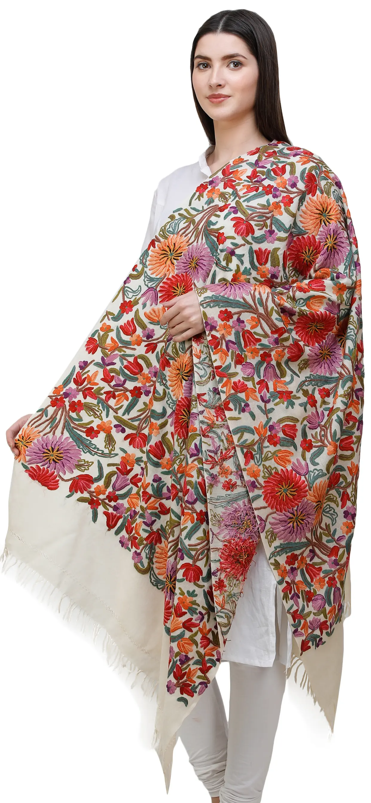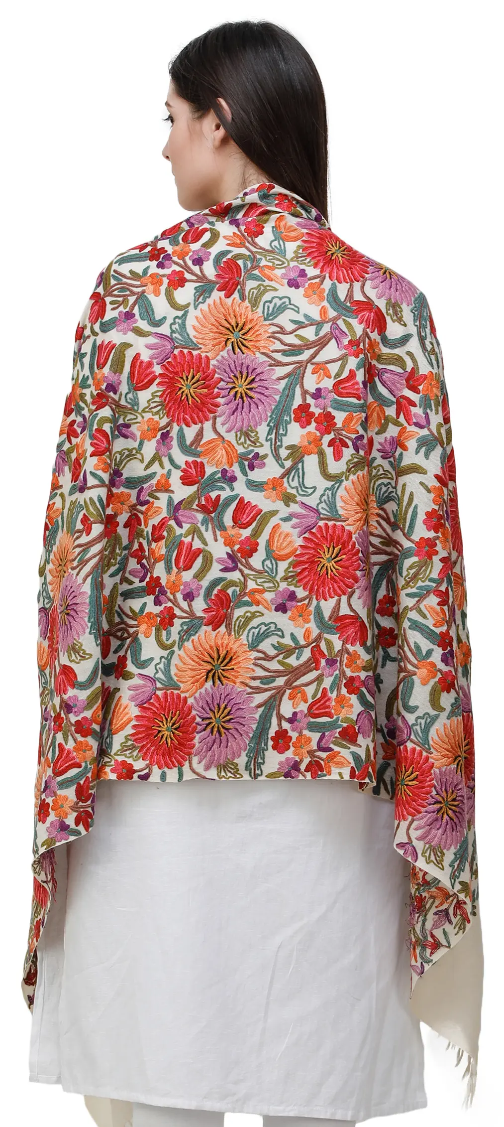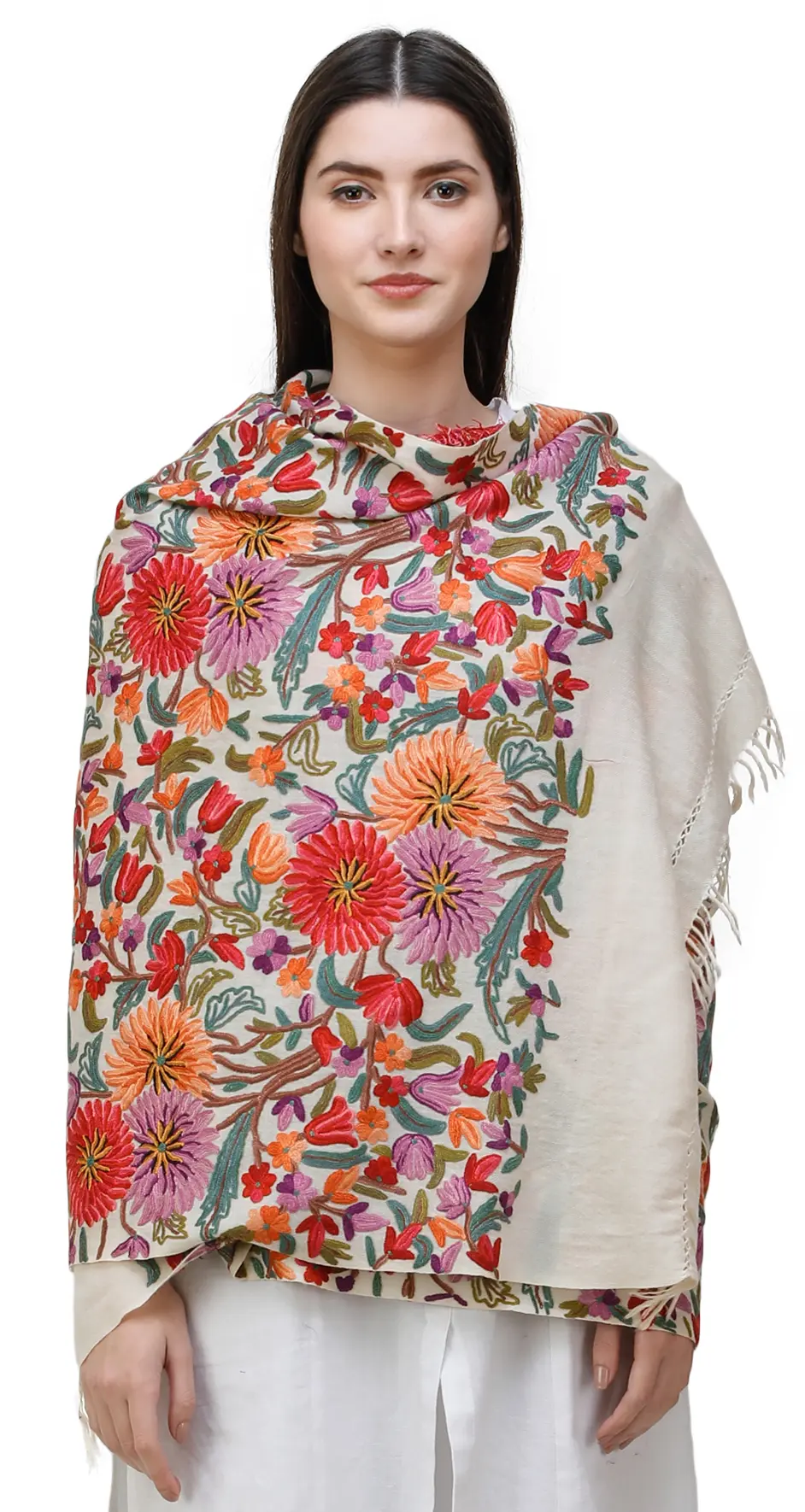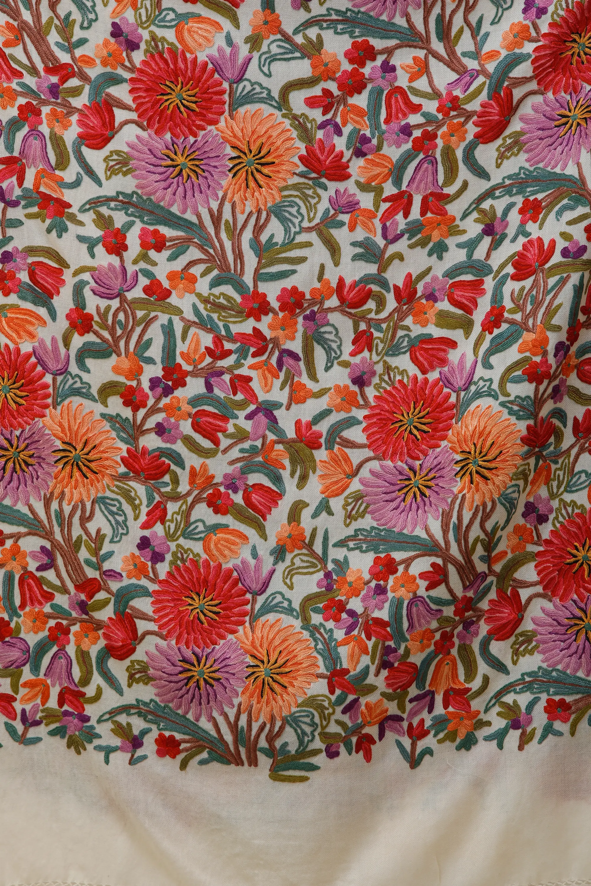 Note the signature colour palette of this shawl. Tints of warm pastels such as orange and mauve and red, of flowers gathered in bunches of three across the field of the shawl. The flowers are interspersed with vines of the most beauteous colours - soft red blooms, mauve and orange blossoms in multiple shades and tints, and a profusion of green and brown tendrils. A shawl as exquisite as this is just the thing to layer over your choicest Indian sarees and suits.