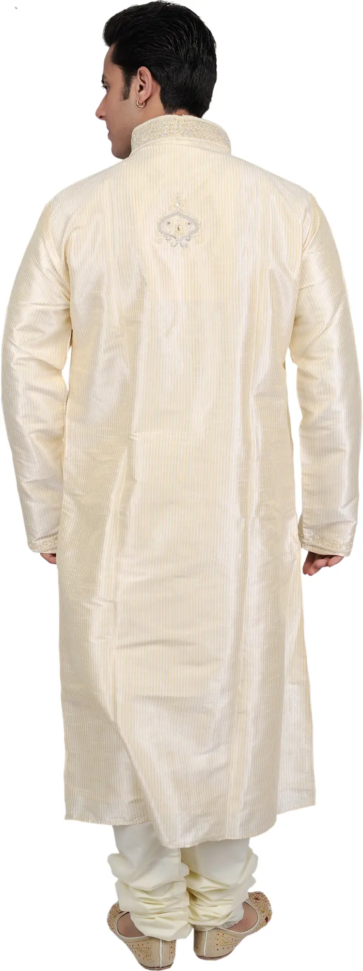 This regal outfit, “a Cream Wedding Kurta Pajama Set,” exemplifies sophistication and heritage. This ensemble, made from rich art silk, has woven stripes that offer a sense of royalty. The brilliantly embroidered beads on the neckline boost the attire, resulting in a fascinating symphony of style and grace.