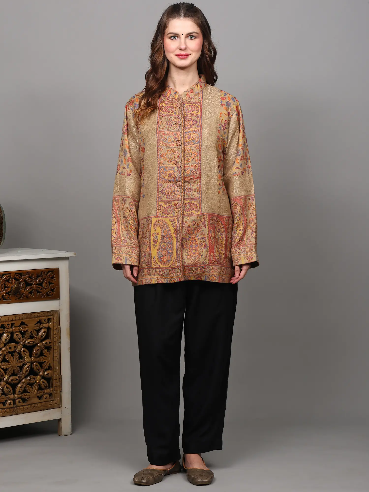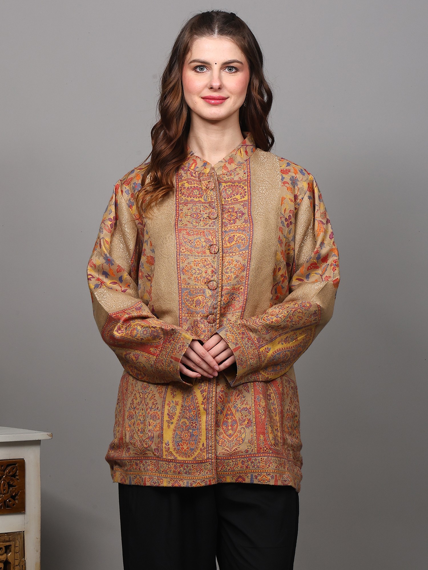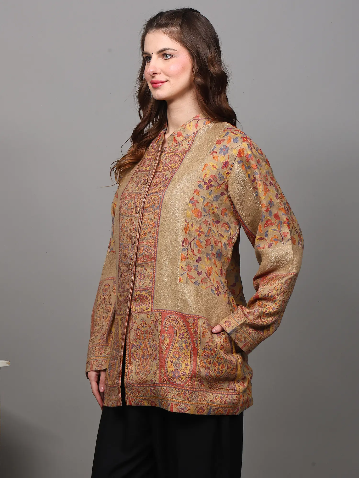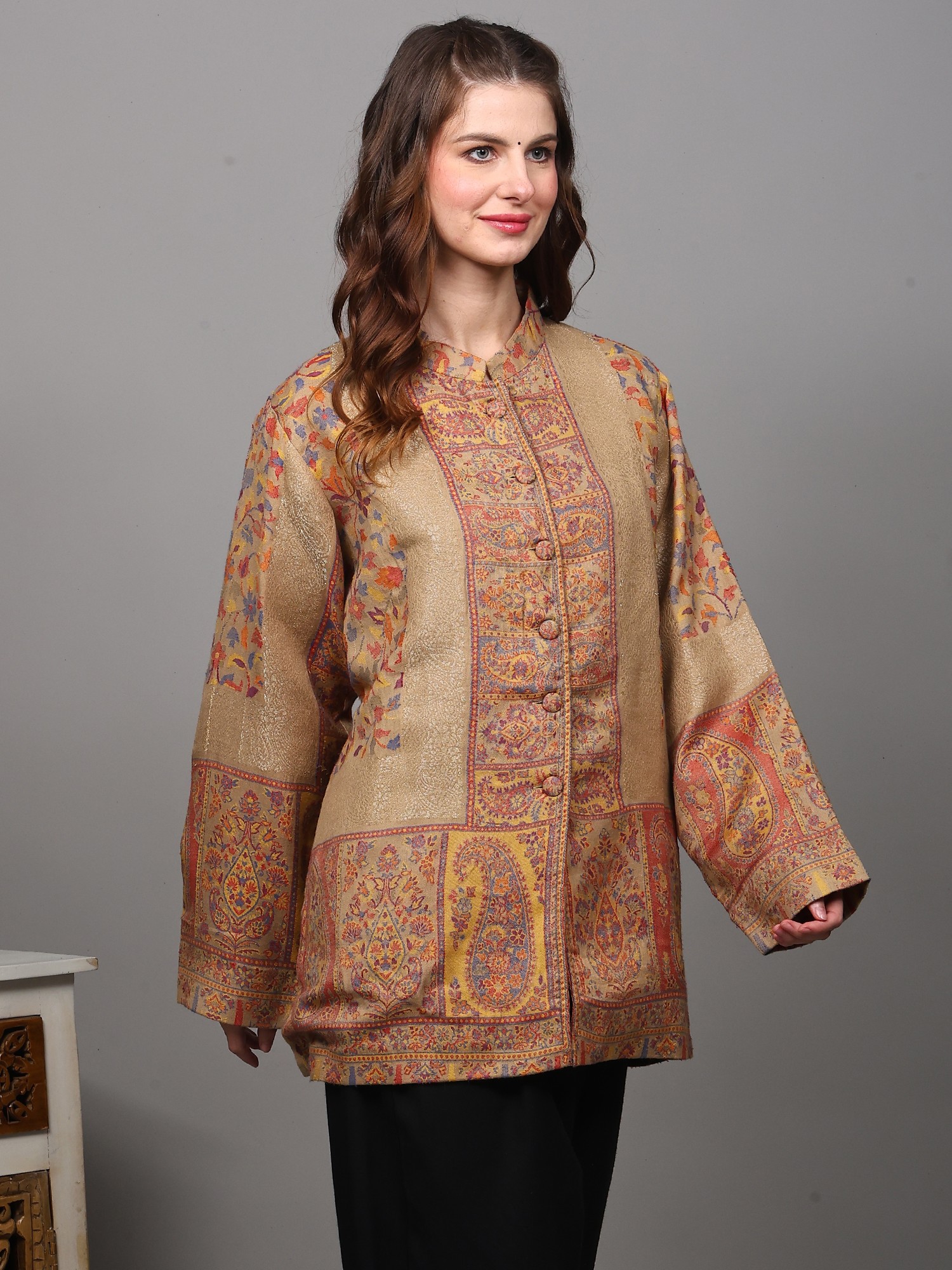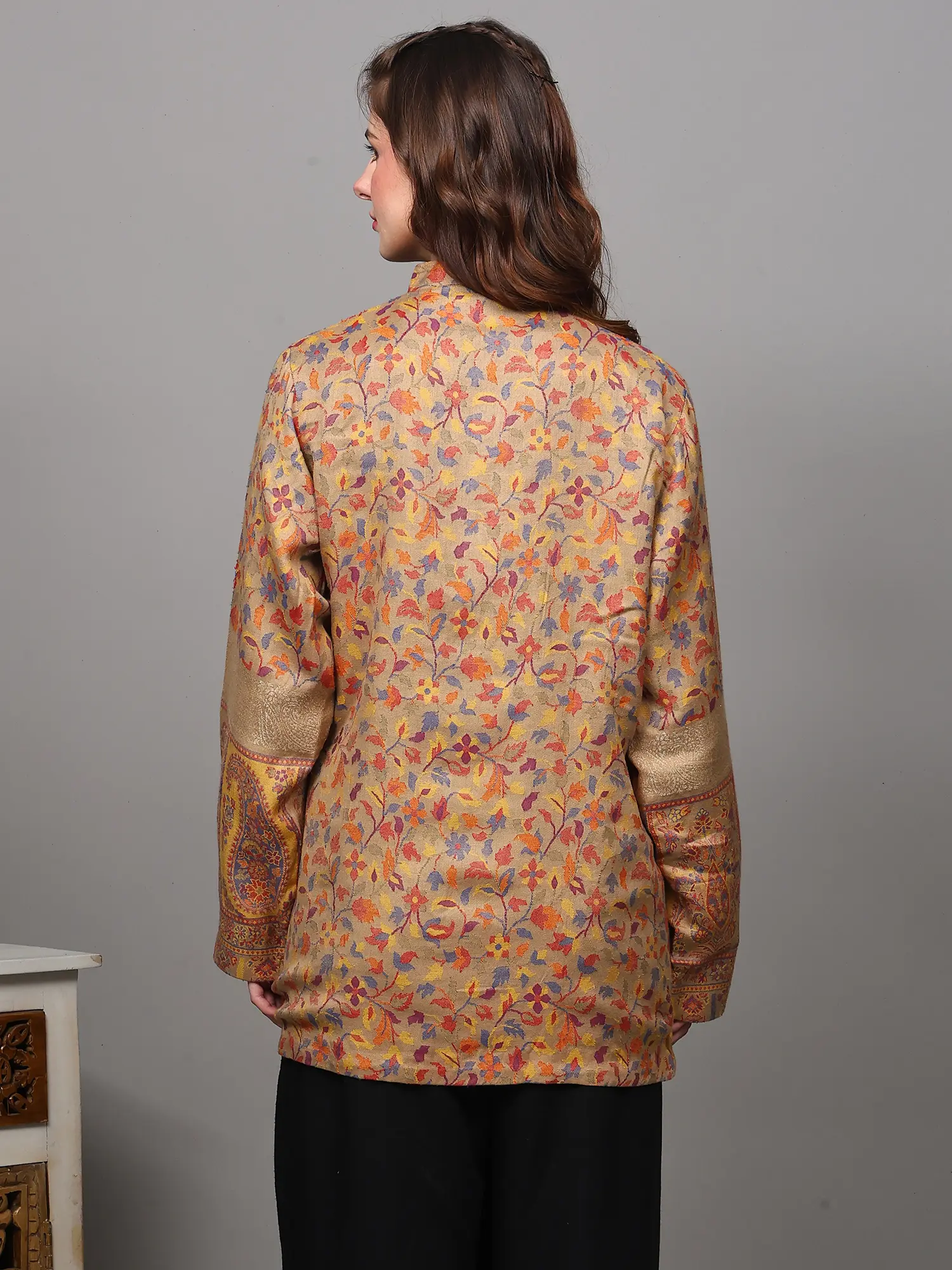 Brazilian-Sand Pure Silk Short Jacket from Kashmir with Floral Vine Aari Embroidery by Hand