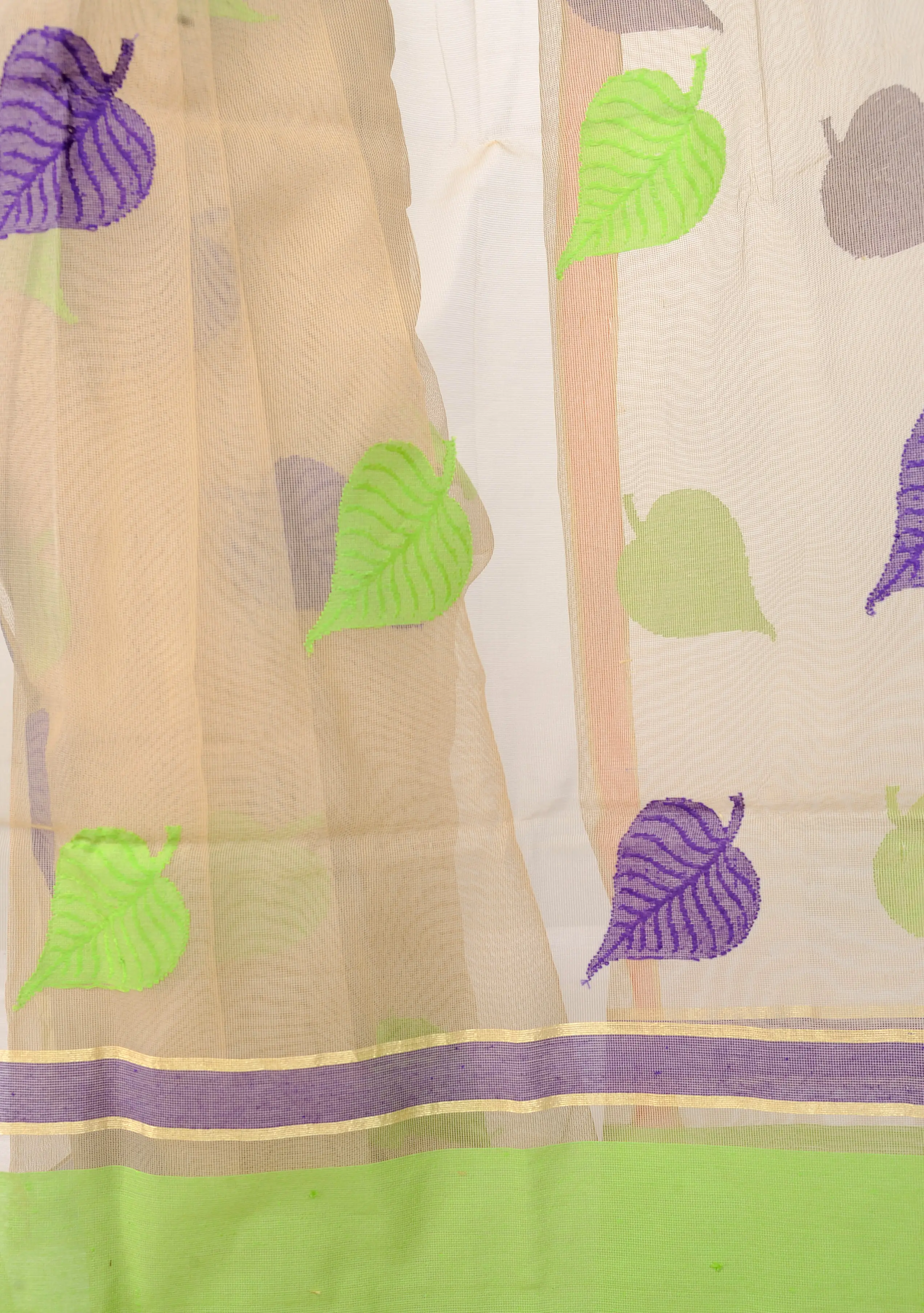 Enter any room with an air of refinement which enjoying comfort with this beautiful net saree, adorned with large leaf motifs on the field. Purple and orange on the border contrast with the muted shade of the saree, with a touch of green- the color of fertility, fortune and bliss on the pallu.