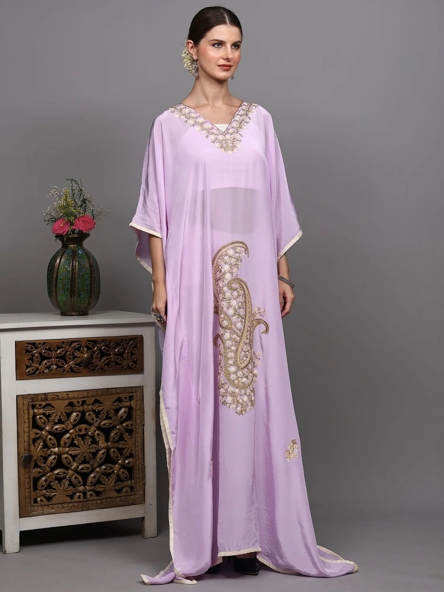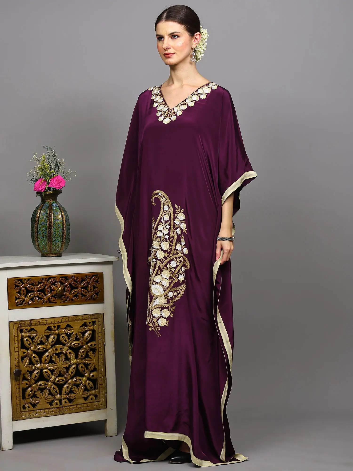Designed for effortless elegance, the long kaftan silhouette is synonymous with relaxed luxury. The generous cut provides ample room for movement, ensuring supreme comfort without compromising on style. The wide sleeves and flowing fabric create a regal aura, making this kaftan perfect for a variety of occasions. Whether you're attending a special event, enjoying a leisurely evening, or seeking a touch of opulence for everyday wear, this kaftan promises to make you feel like royalty. The subtle cream trim along the edges adds a refined finishing touch, framing the rich purple fabric and complementing the intricate embroidery.